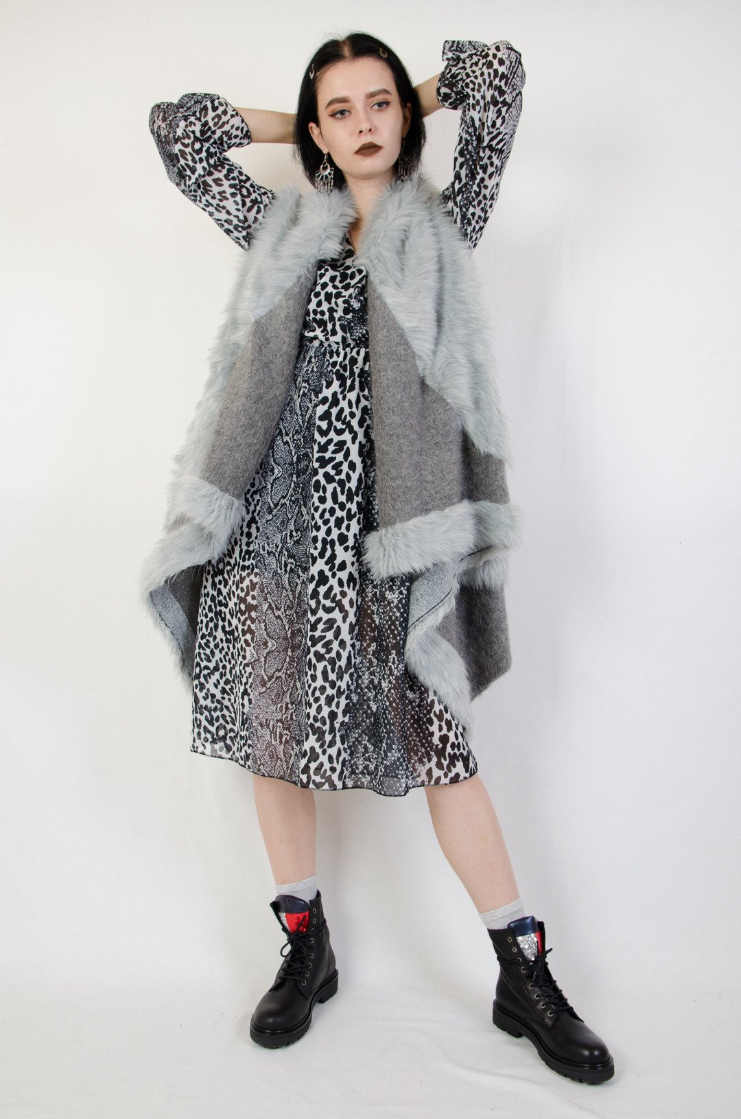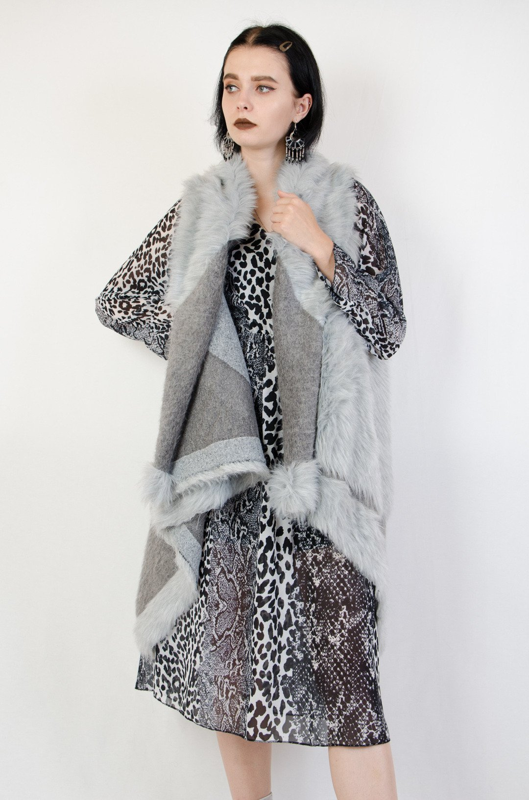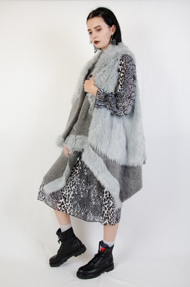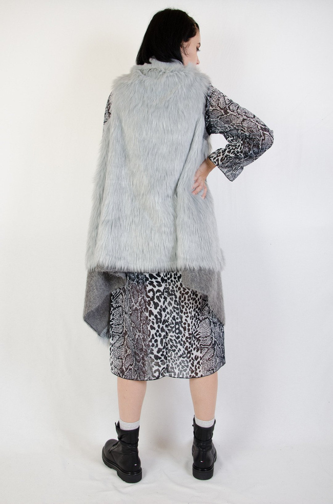 Futrzana jasnoszara kamizelka o asymetrycznym kroju.