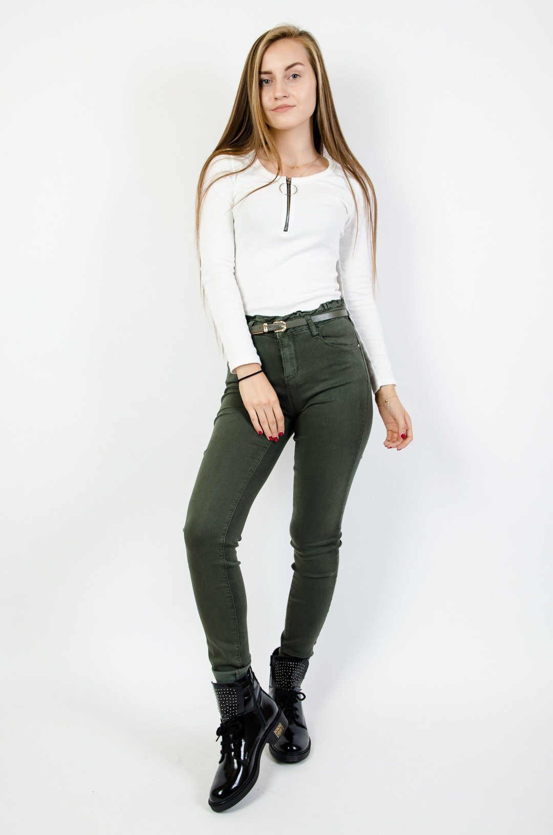 Zielone spodnie skinny z wysokim stanem + pasek
