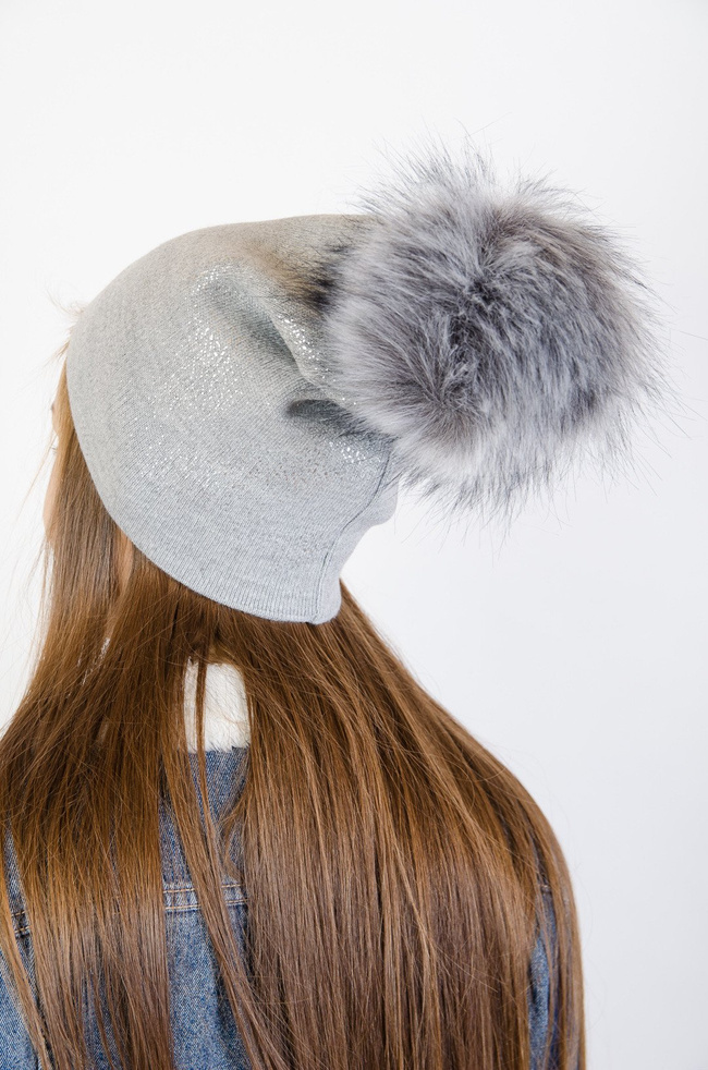 Jasno-szara czapka pokryta brokatem z pomponem .