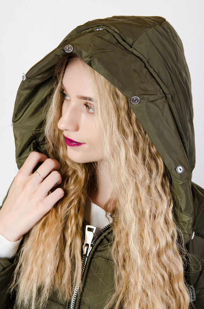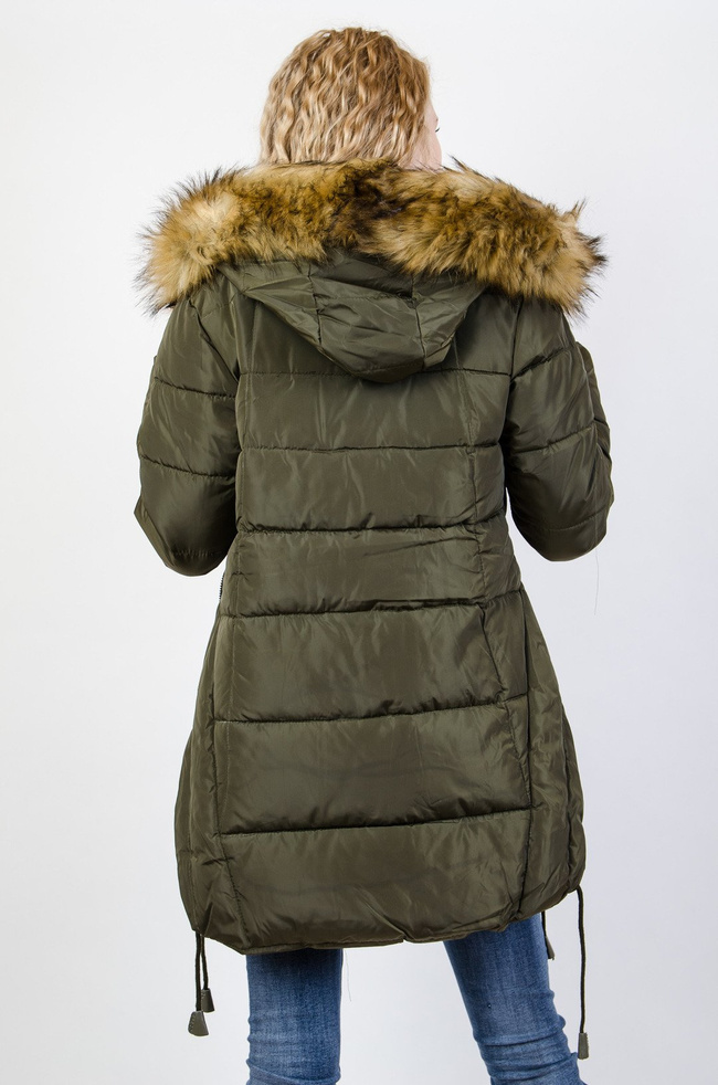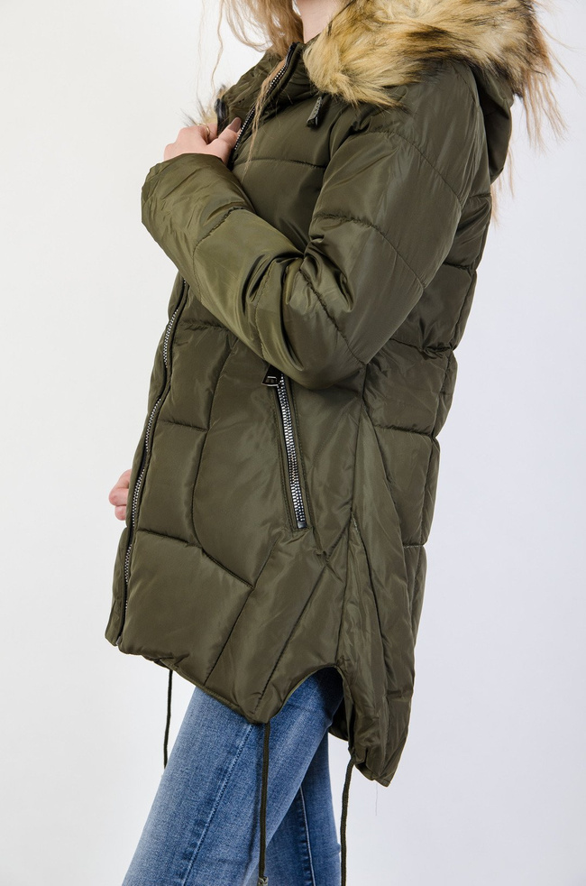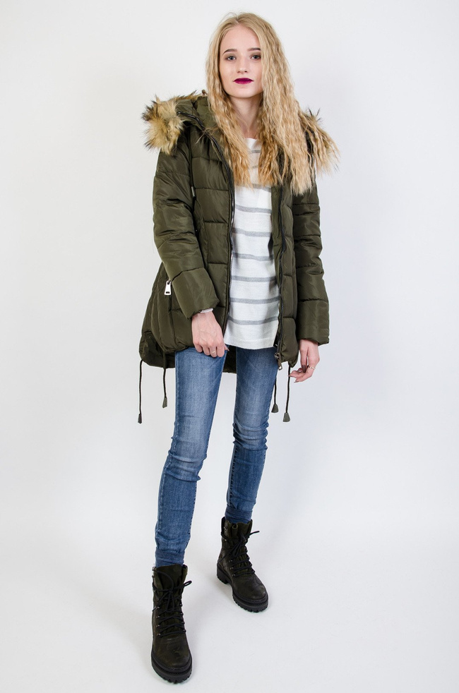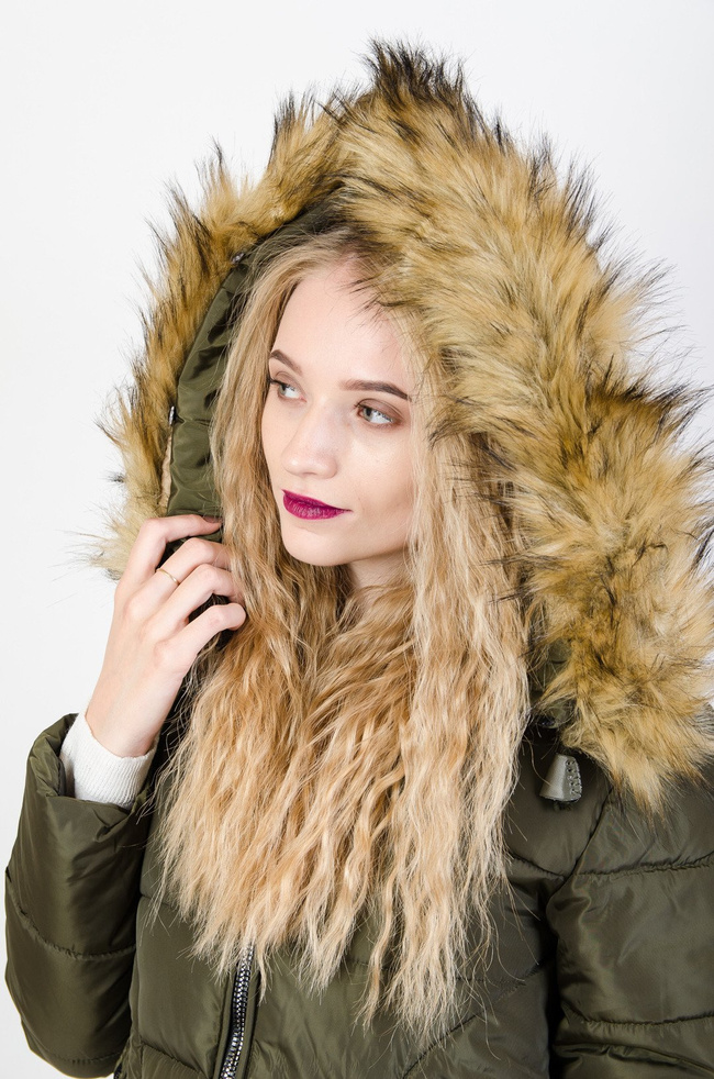 Zielona kurtka pikowana z rozcięciami po bokach. Możliwe jest odpięcie futerka przy kapturze.