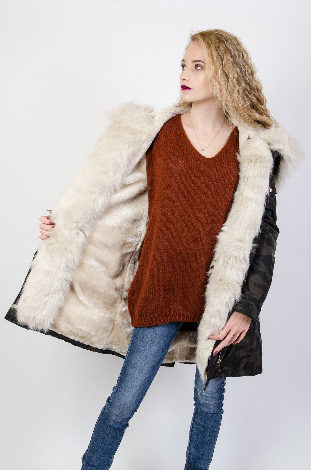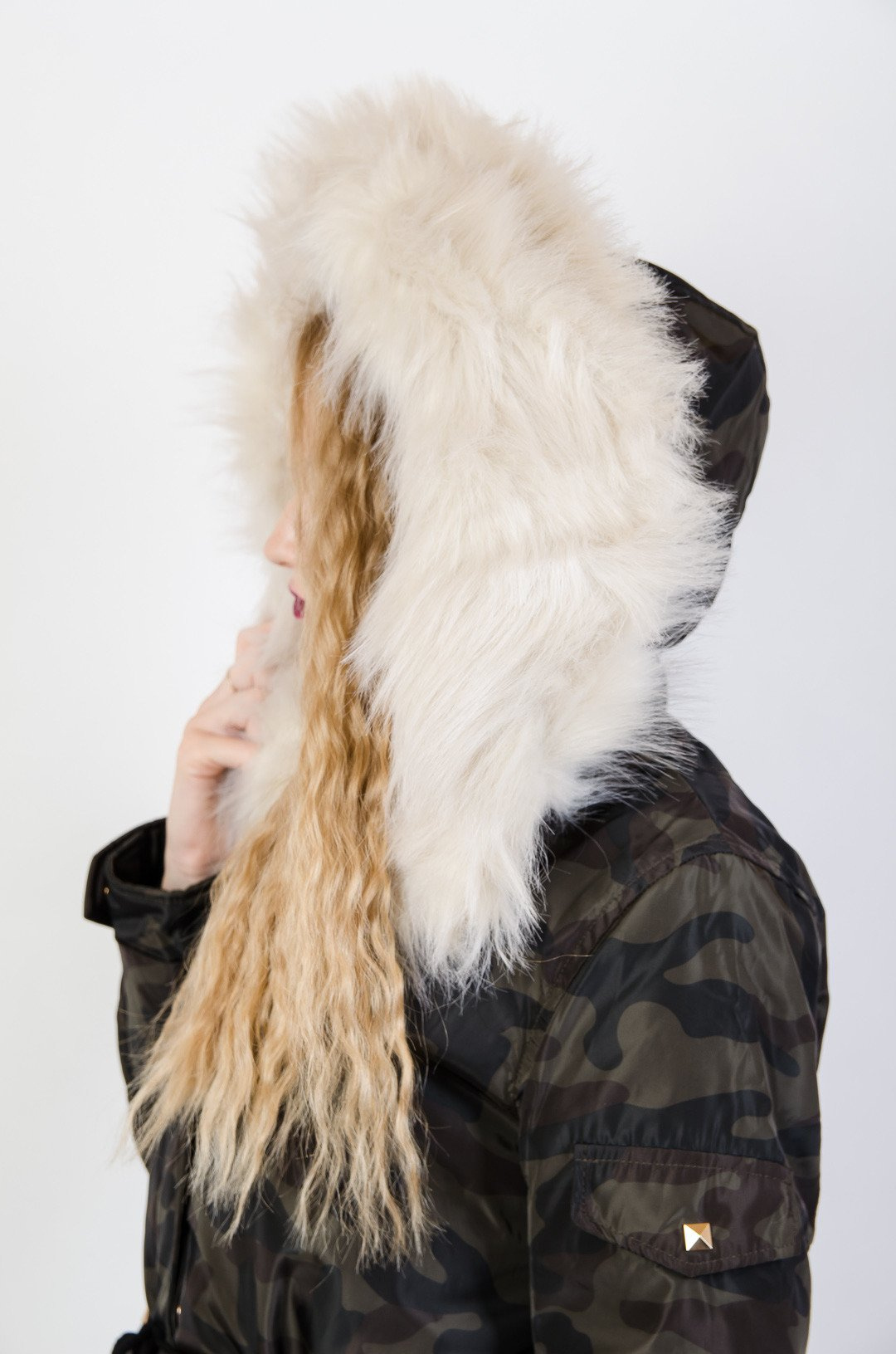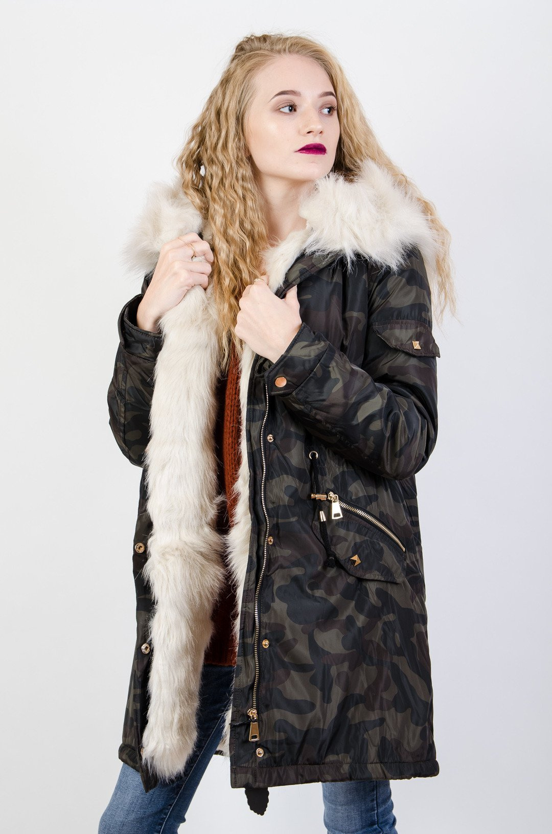 Kurtka moro ocieplana z futerkiem. Futerko przy zamku oraz na kapturze jest odpinane, co widać na zdjęciach.
