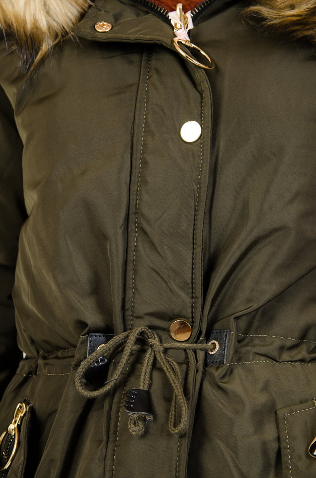 Zielono-czarna dwustronna kurtka. Możliwe jest odpięcie futerka przy kapturze.