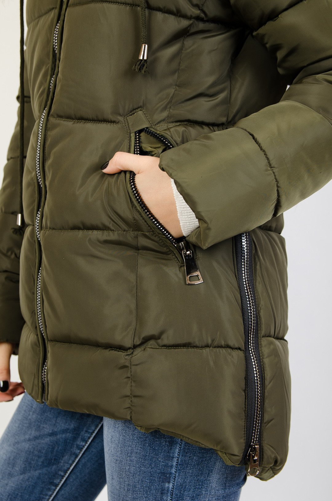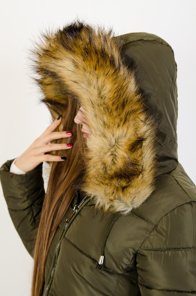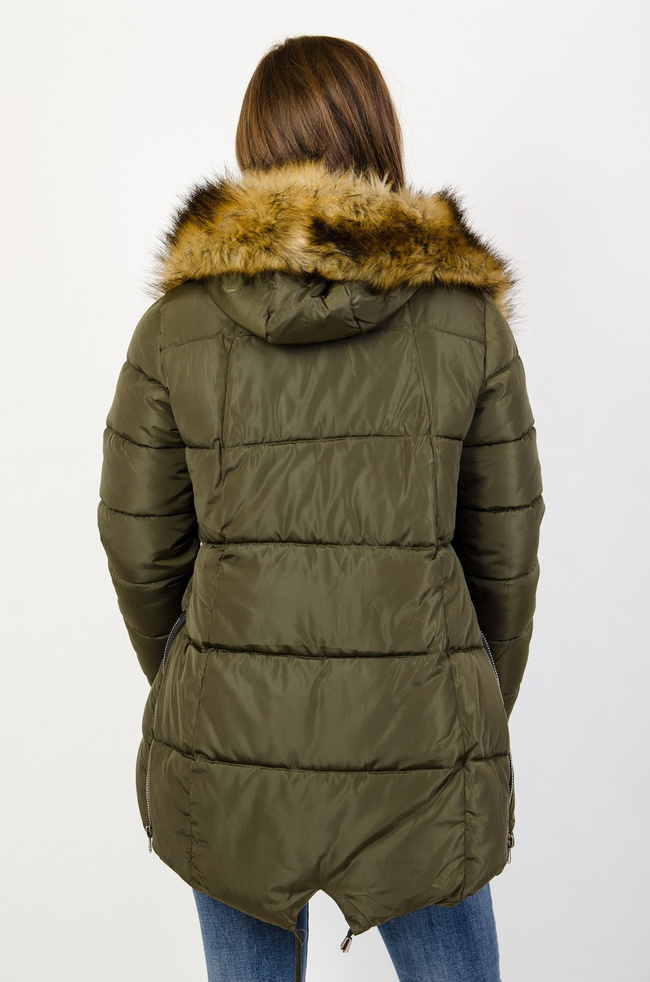 Zielona ocieplana kurtka z zamkami po bokach. Możliwe jest odpięcie futerka przy kapturze.