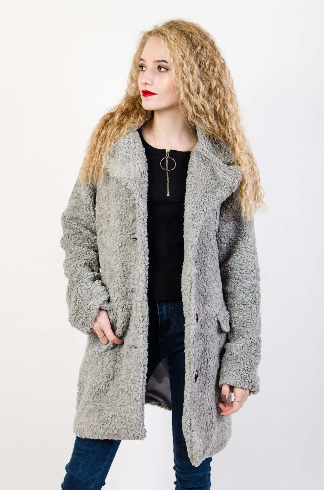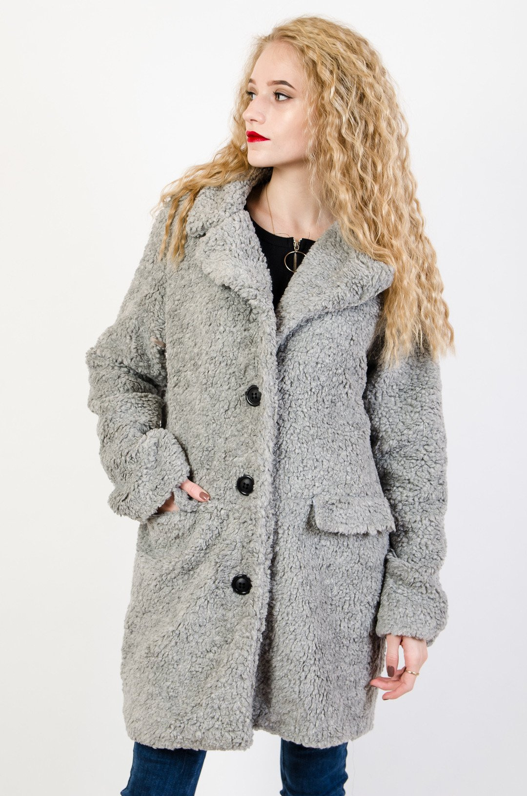 Szary pluszowy płaszcz zapinany na guziki