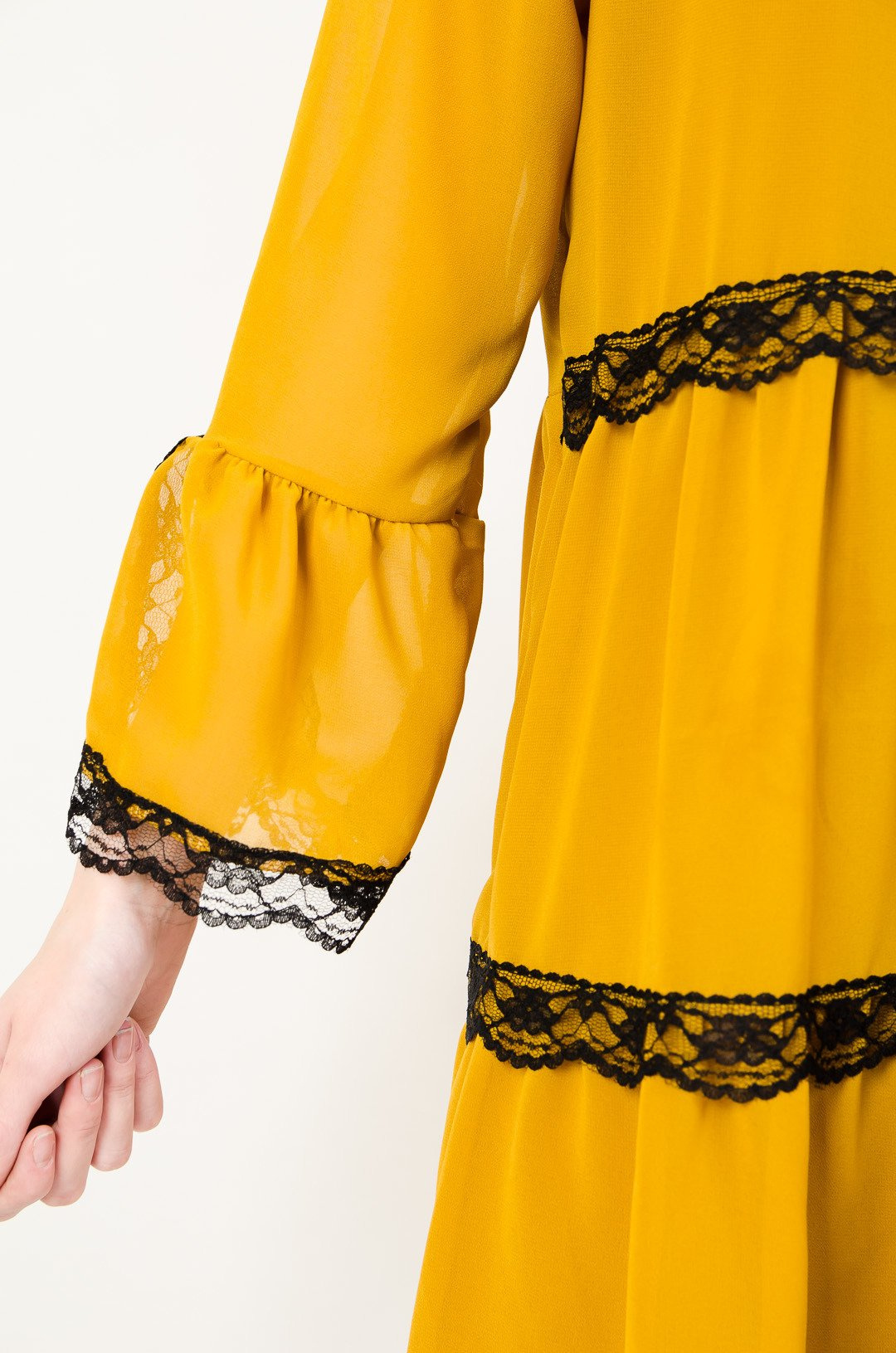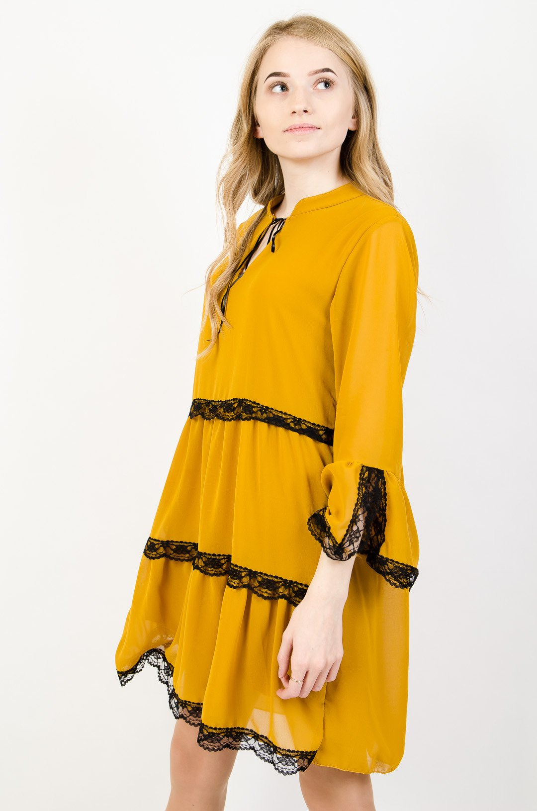Musztardowa sukienka delikatnie rozszerzana z falbaną oraz elementami koronki.