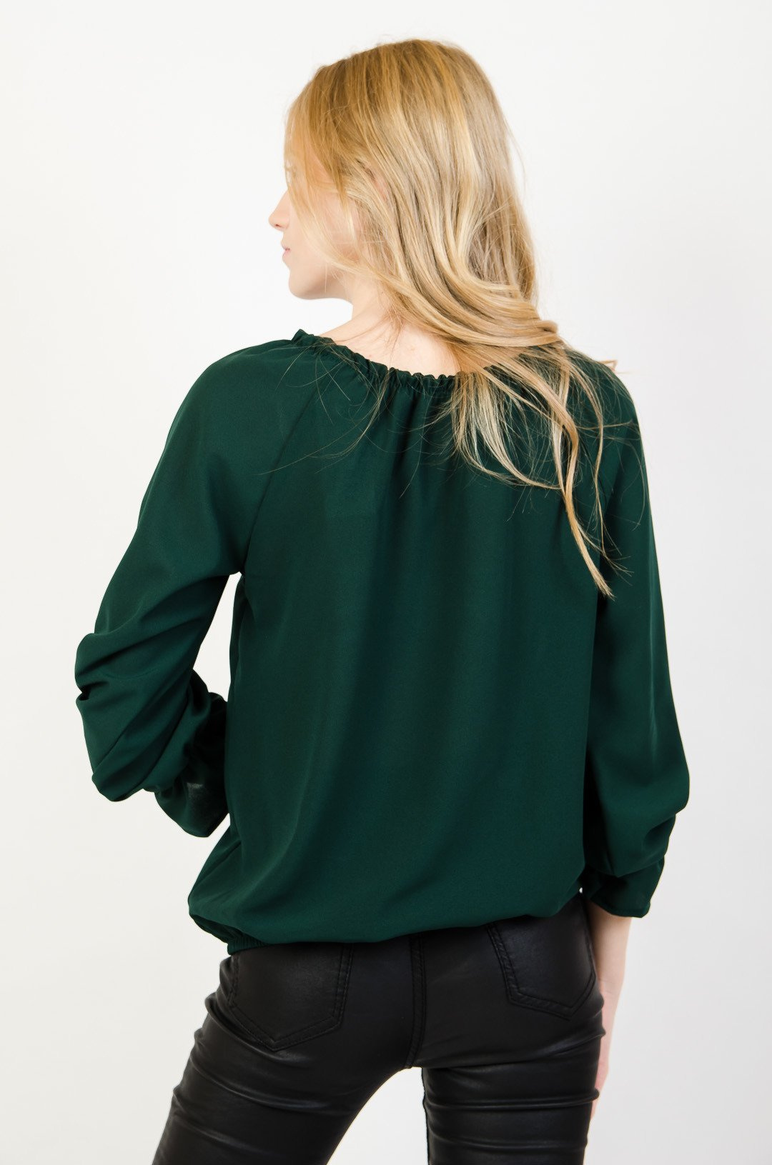 Zielona bluzka z gumką w dekolcie oraz rozszerzanymi rękawami.