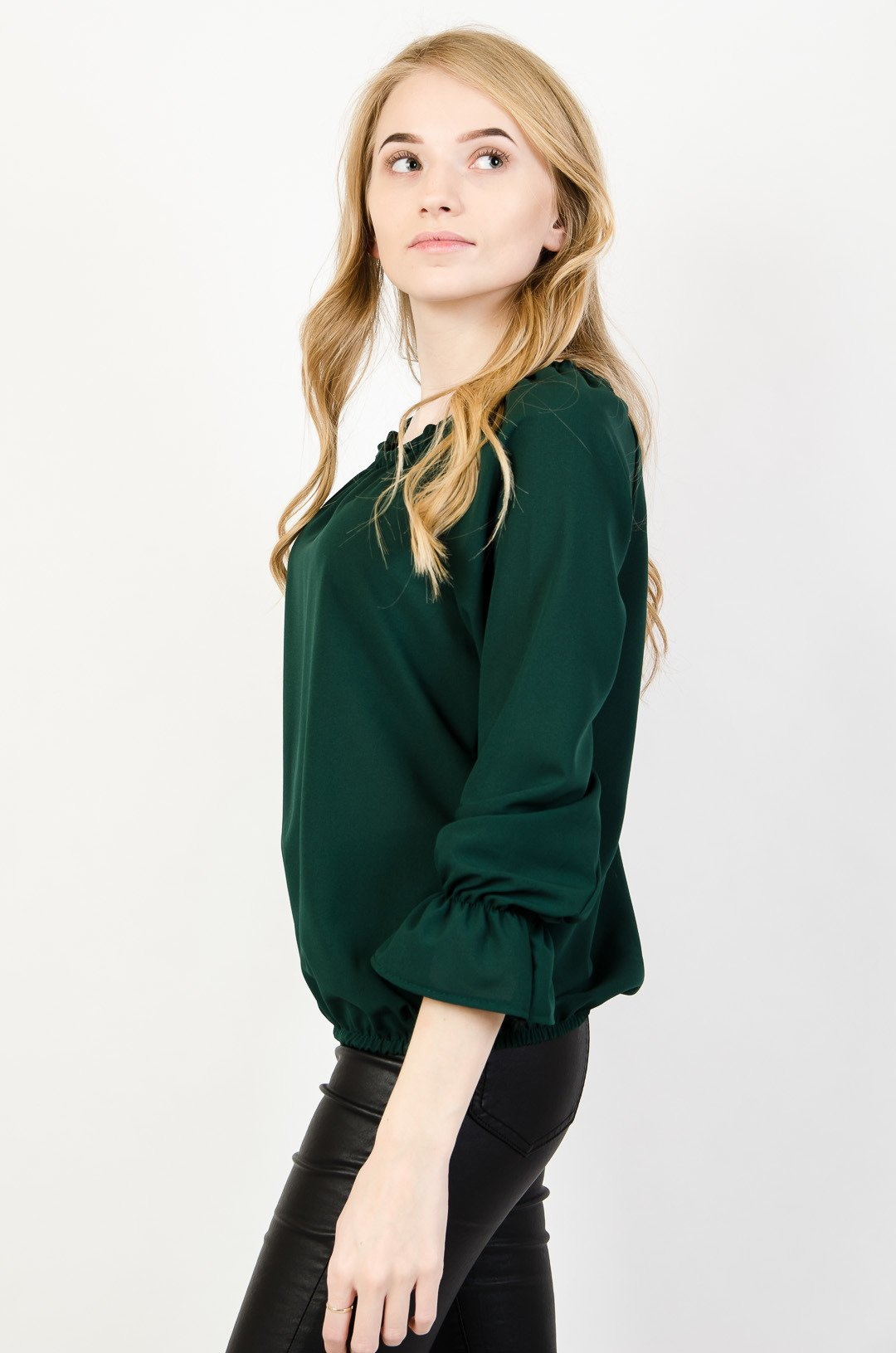 Zielona bluzka z gumką w dekolcie oraz rozszerzanymi rękawami