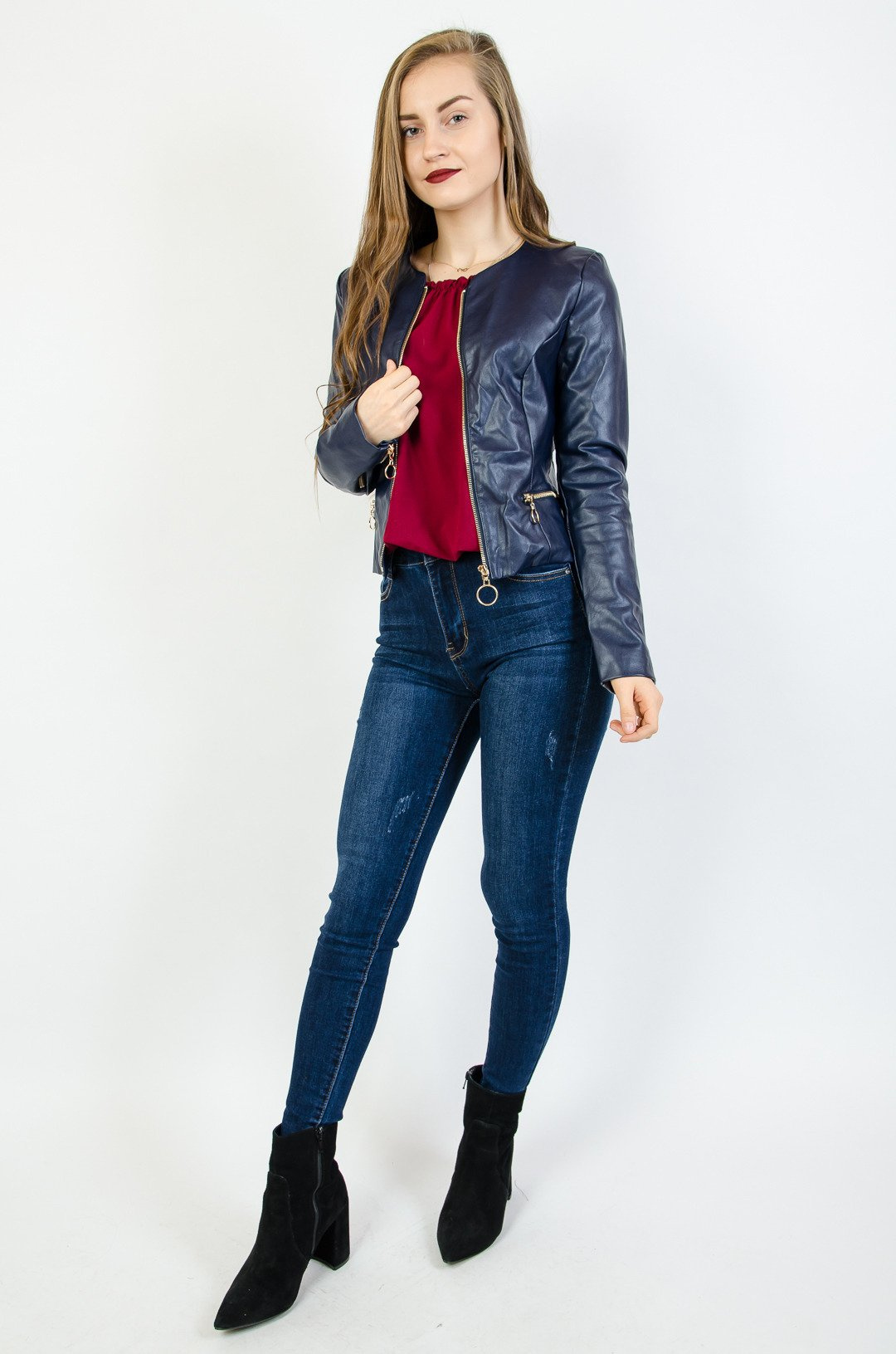 Granatowa ramoneska ze złotymi zamkami, bez kołnierza.