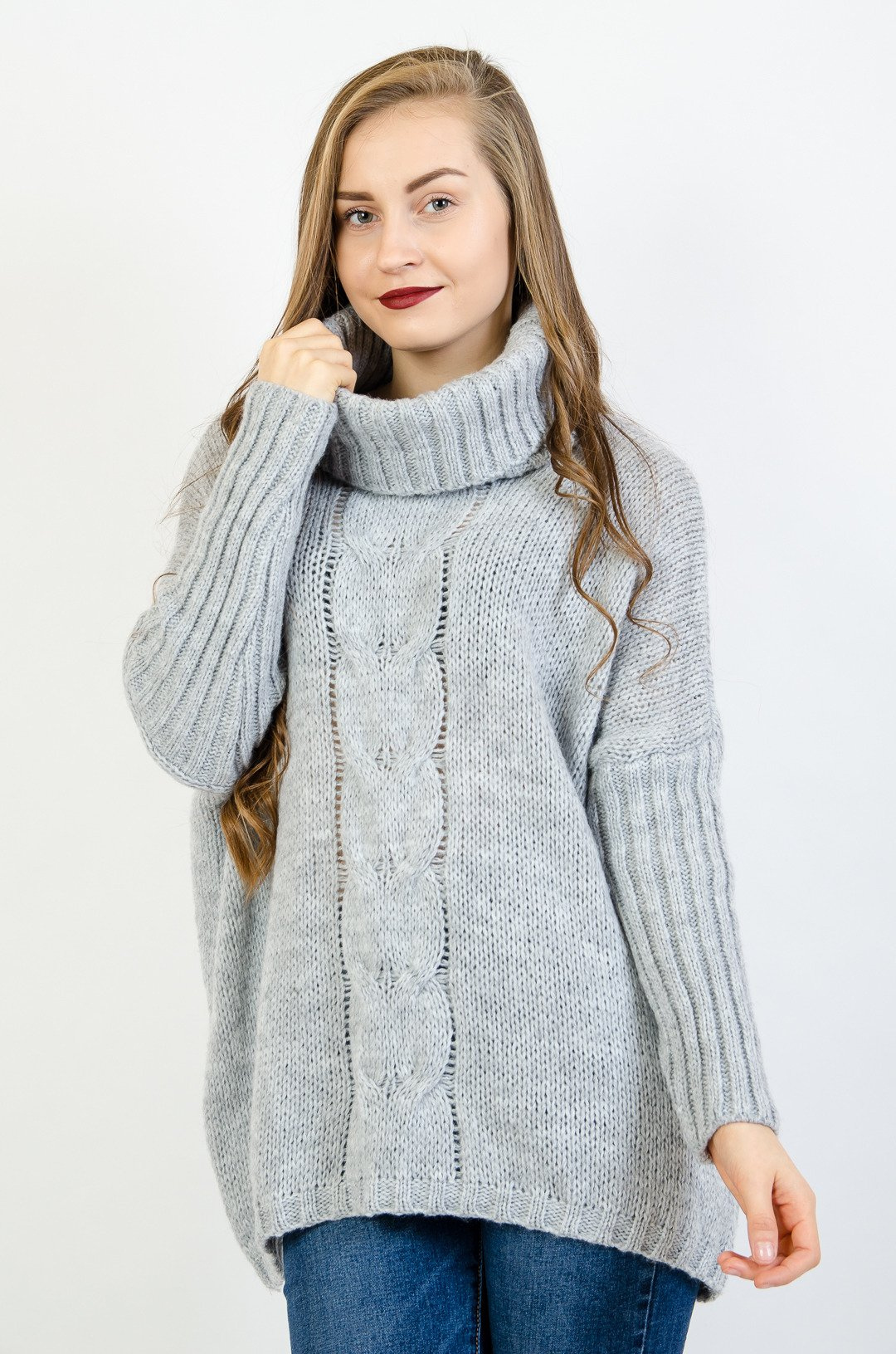 Szary asymetryczny sweter typu nietoperz z golfem