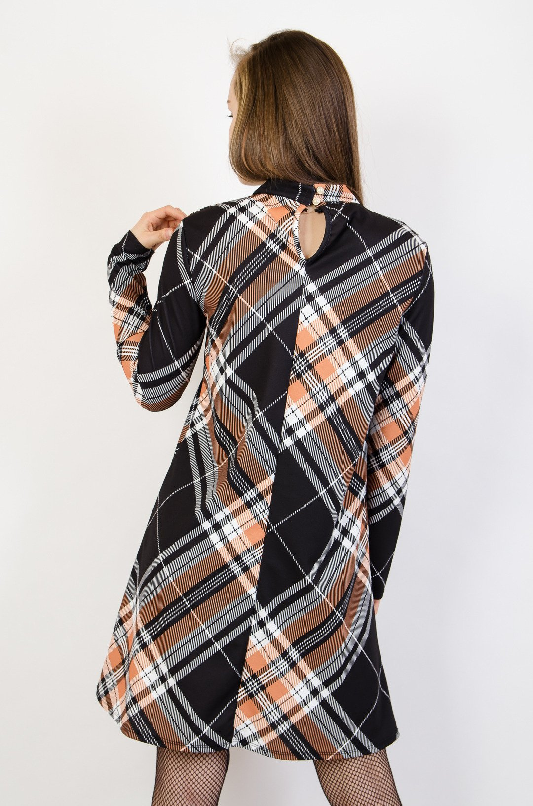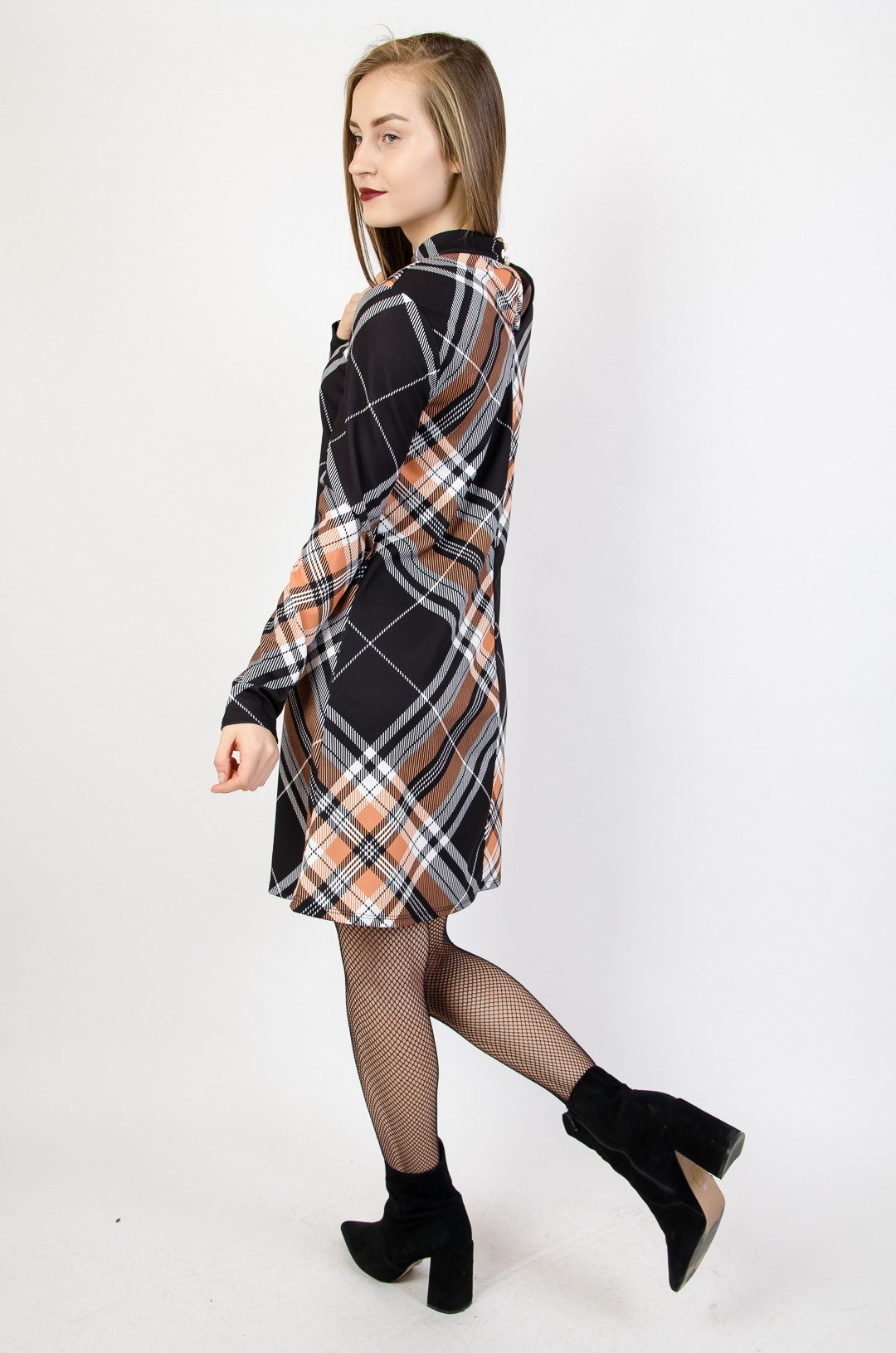 Prosta sukienka w czarno-brązową kratę z długim rękawem.