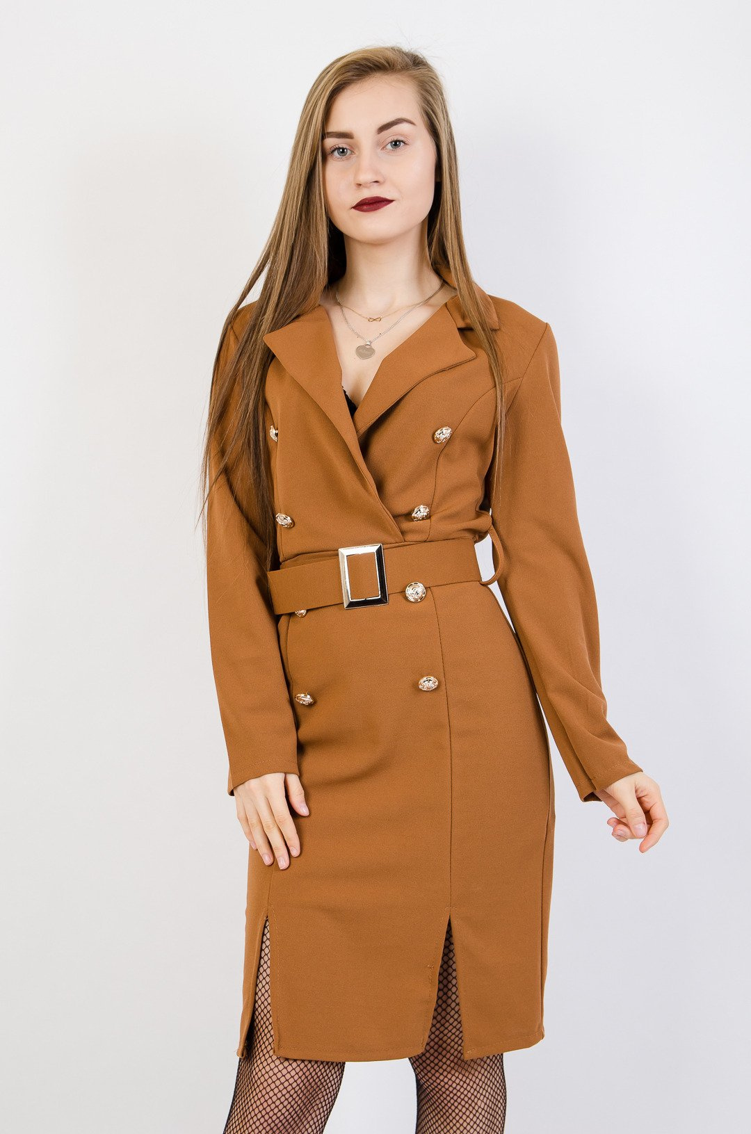 Brązowa sukienka ala marynarka ze złotymi guzikami