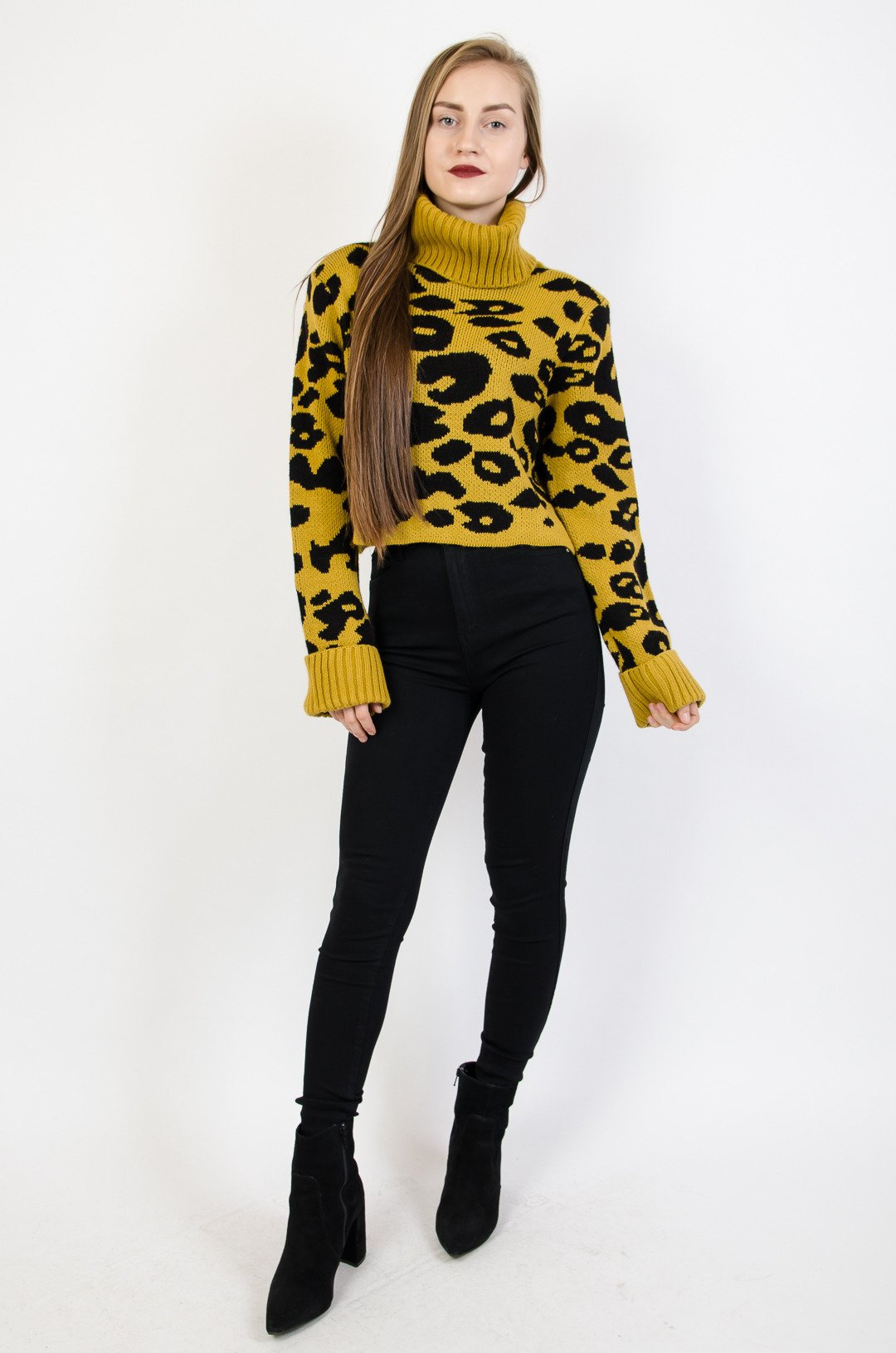 Musztardowy krótki sweter -golf w cętki