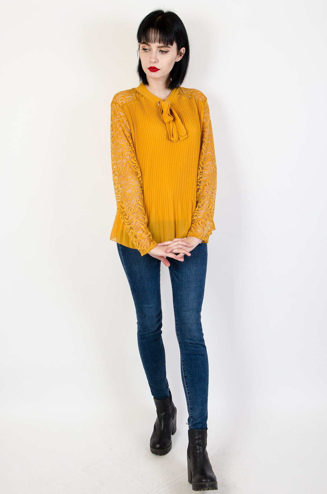 Musztardowa plisowana koszula z koronkowymi rękawami