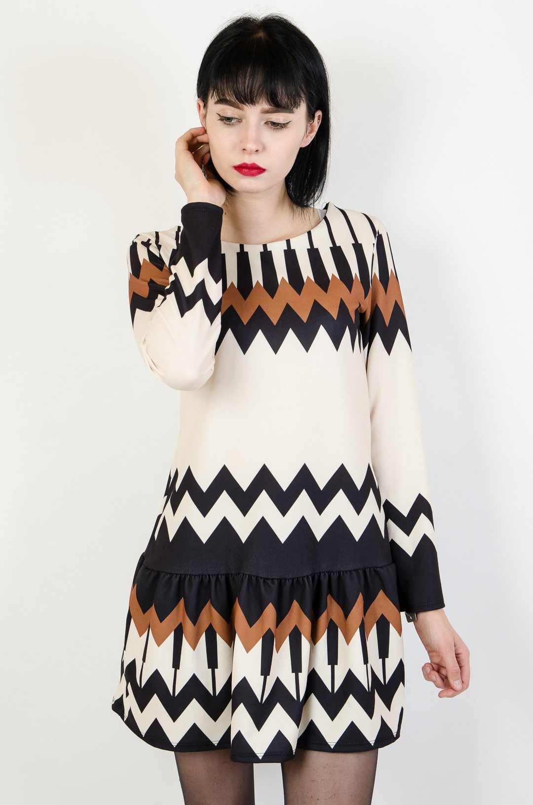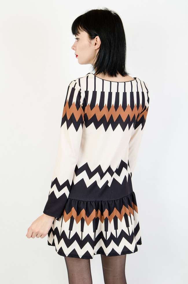 Beżowa sukienka w czarno-brązowe wzory z falbaną na dole.