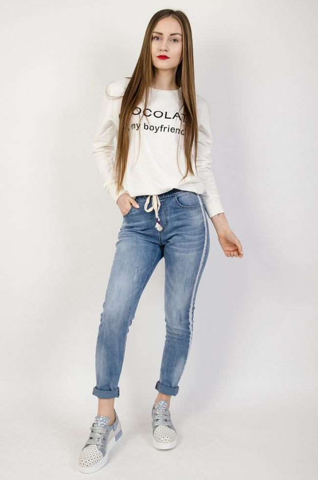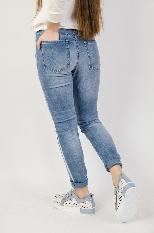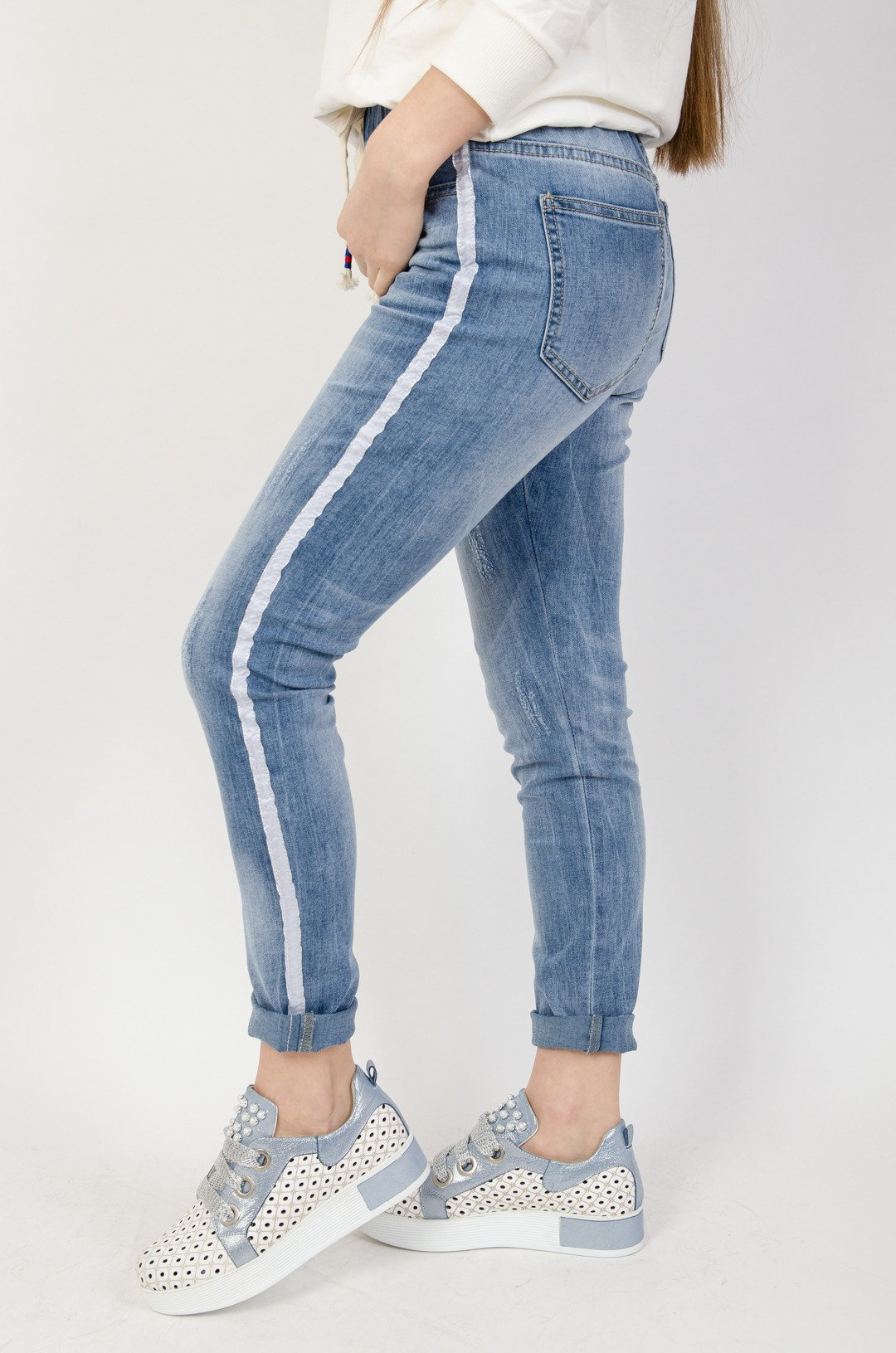 Jasne spodnie jeansowe z lampasem i gumką w pasie