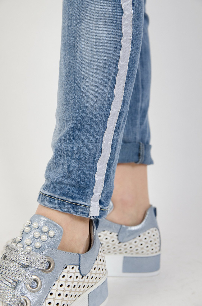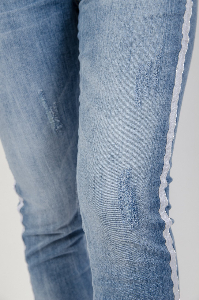 Jasne spodnie jeansowe z połyskującym lampasem. Posiadają gumkę w pasie, wiązane na sznurki.