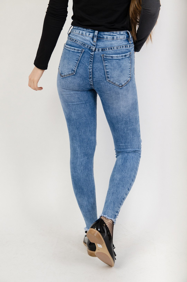 Jasne spodnie jeansowe z dziurami oraz szarpaną nogawką