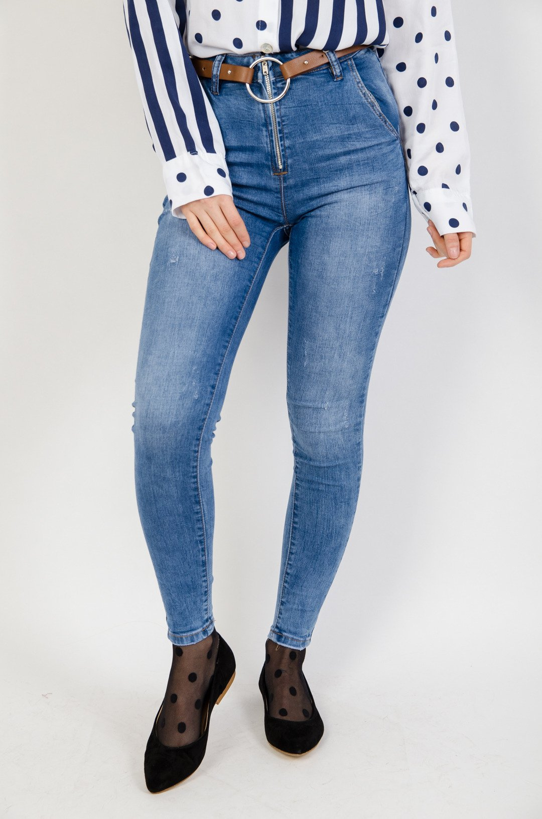 Niebieskie spodnie jeansowe z zamkiem z przodu.