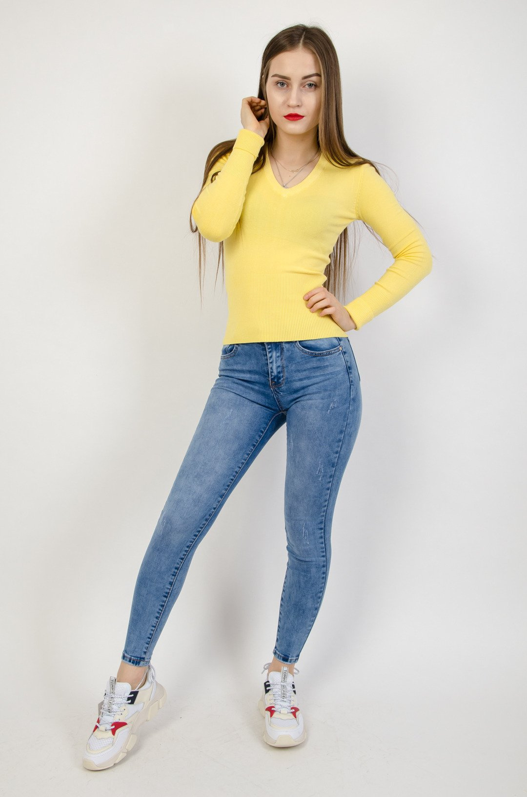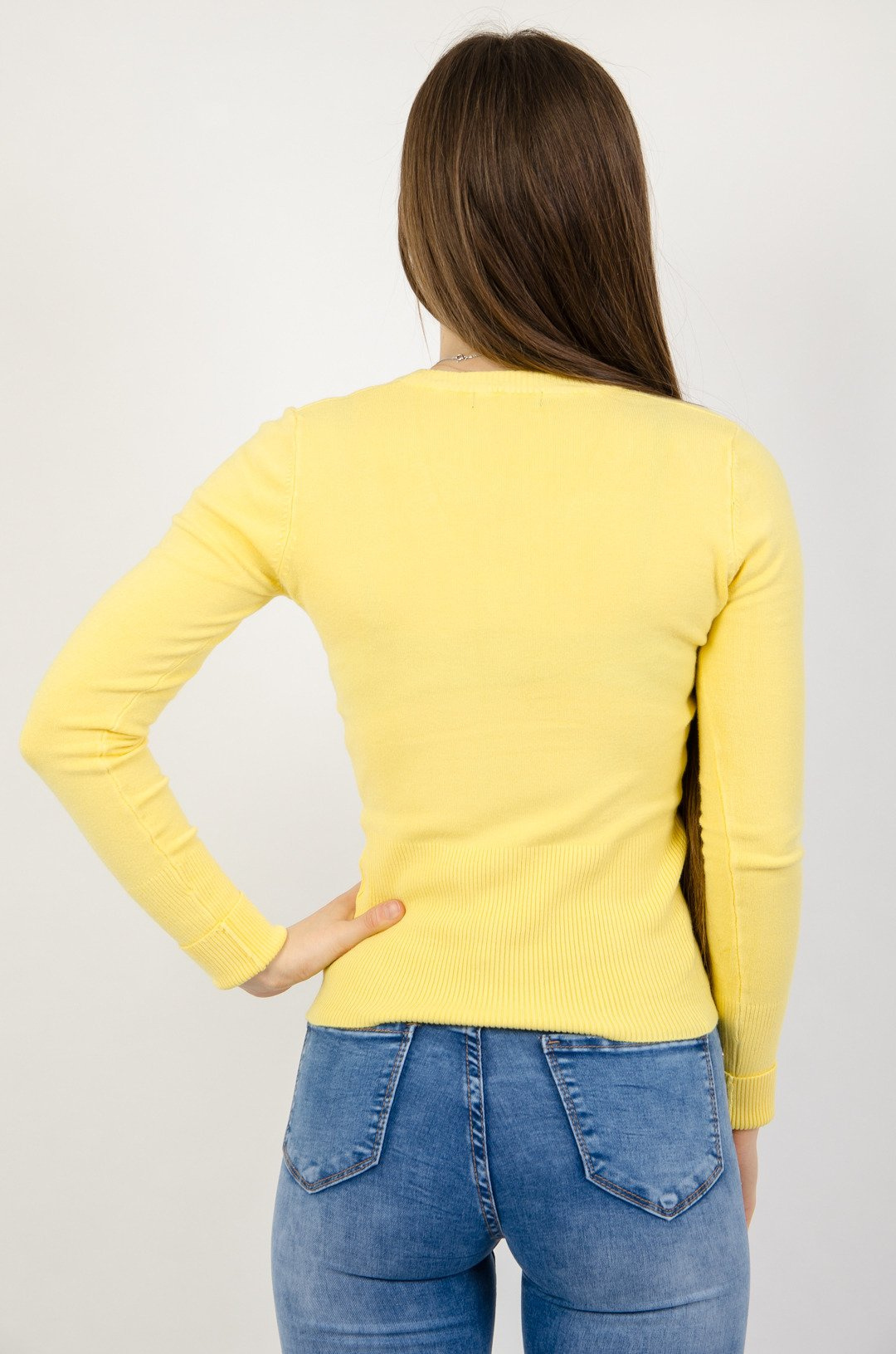 Żółty sweter z dekoltem w serek.