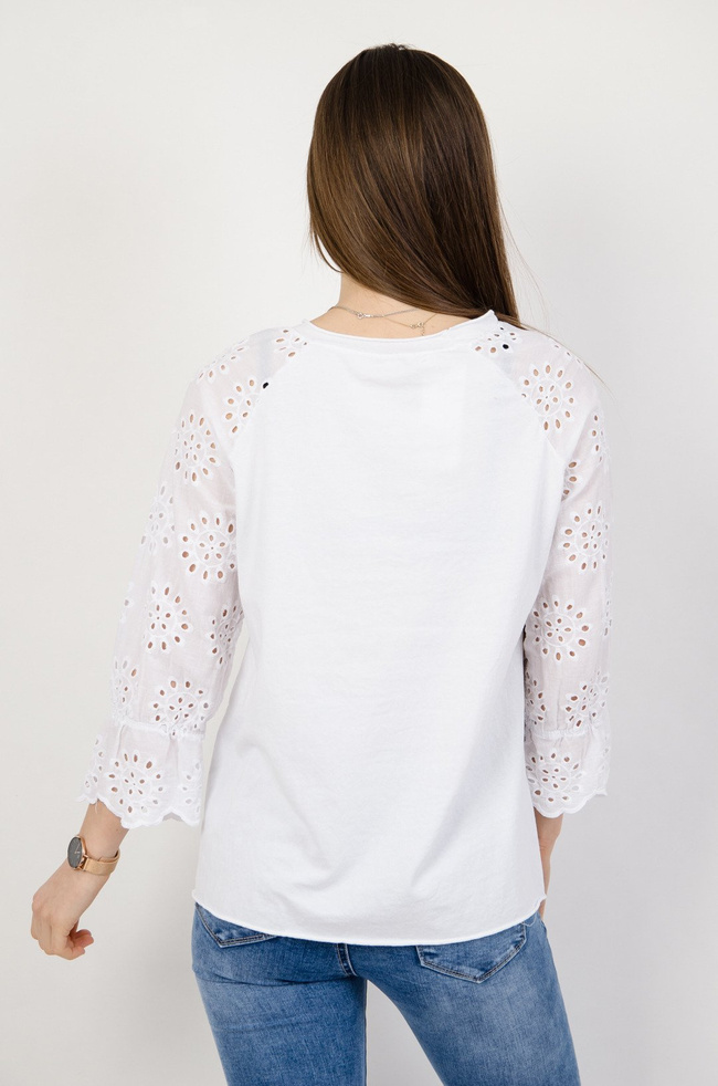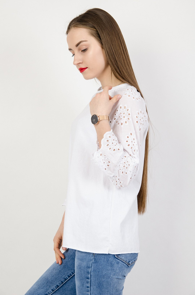 Biała bluzka z ażurowymi rękawami.