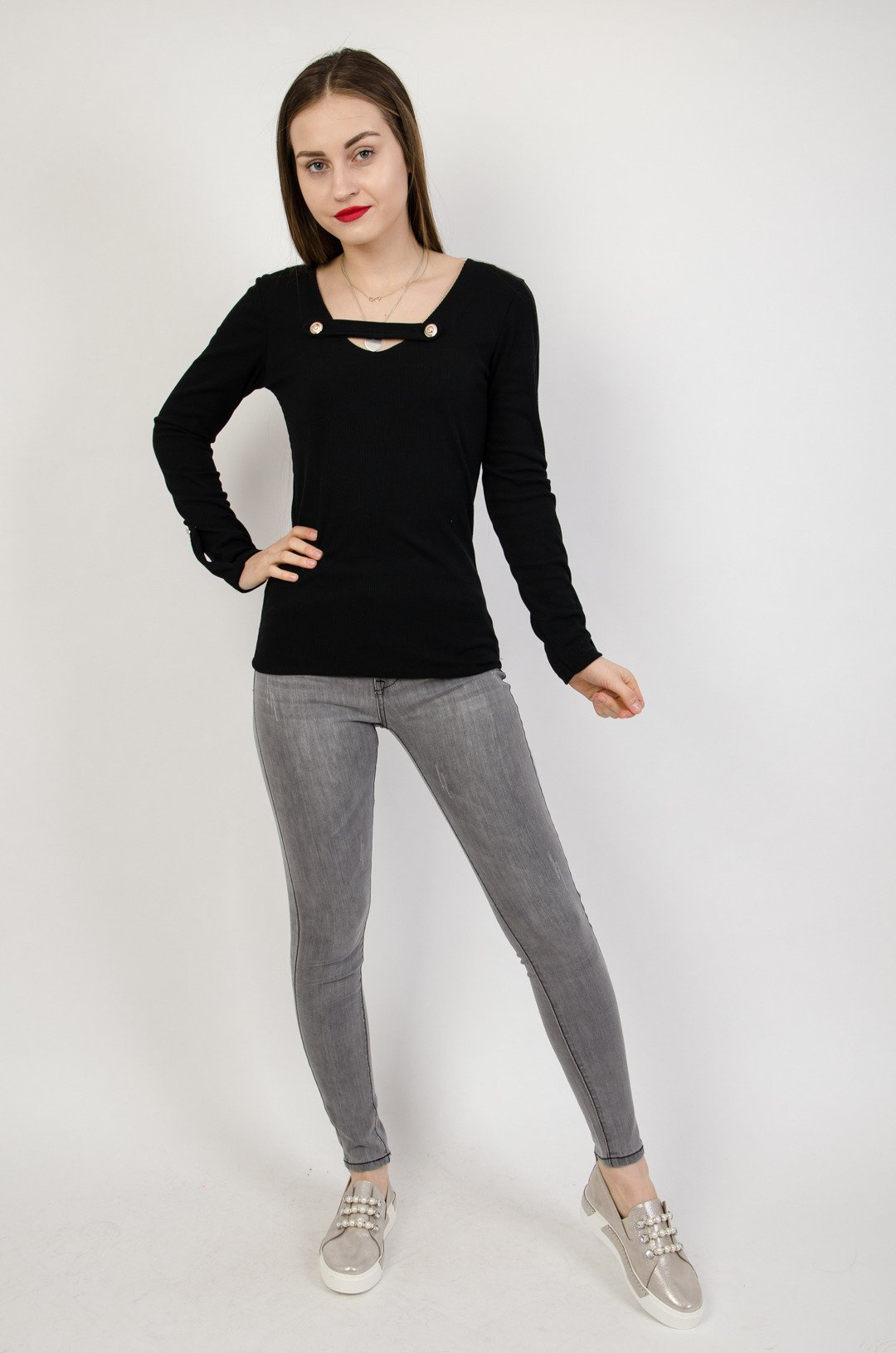 Czarna prążkowana bluzka z guzikami przy dekolcie.