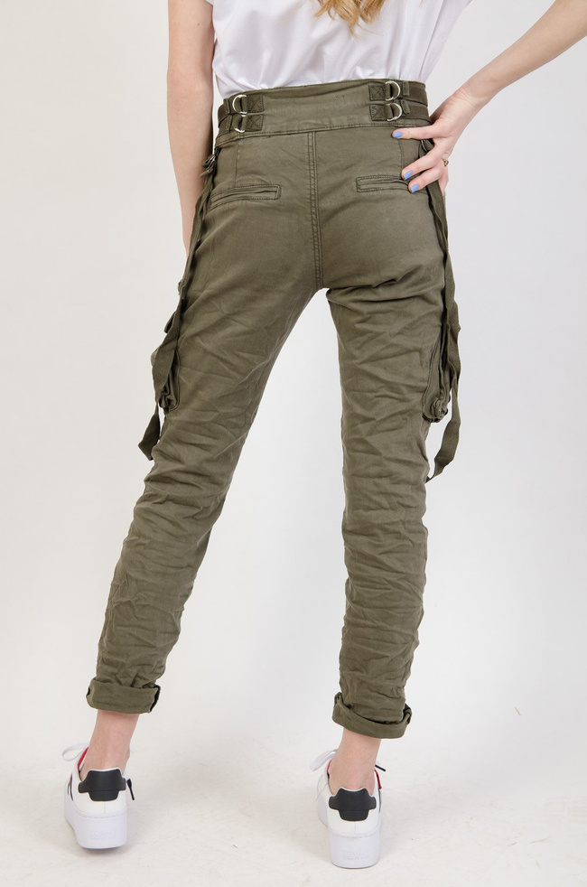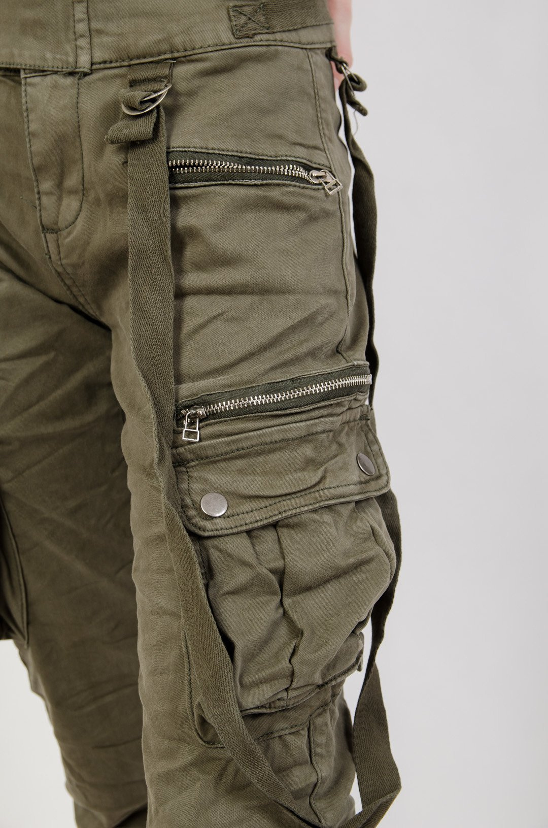 Zielone spodnie joggery z zamkami oraz szelkami.