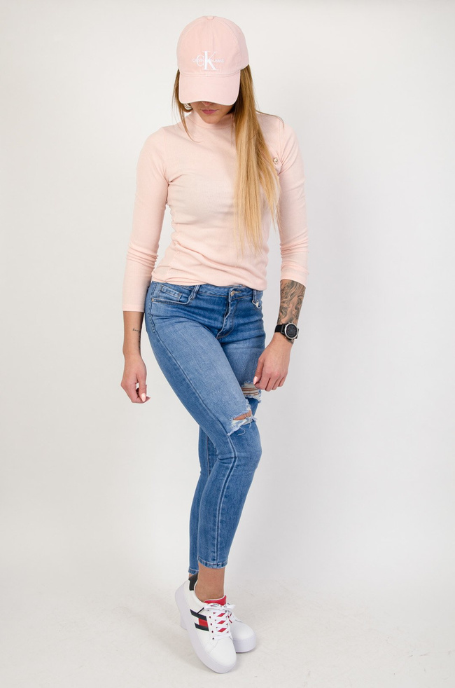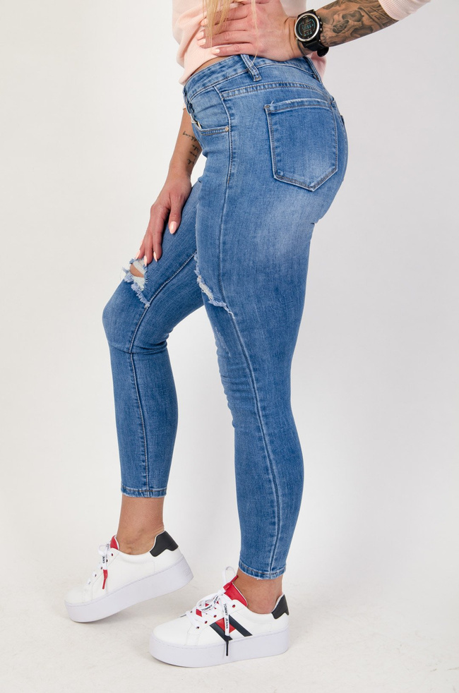 Jasne spodnie jeansowe z dużymi szarpaniami.