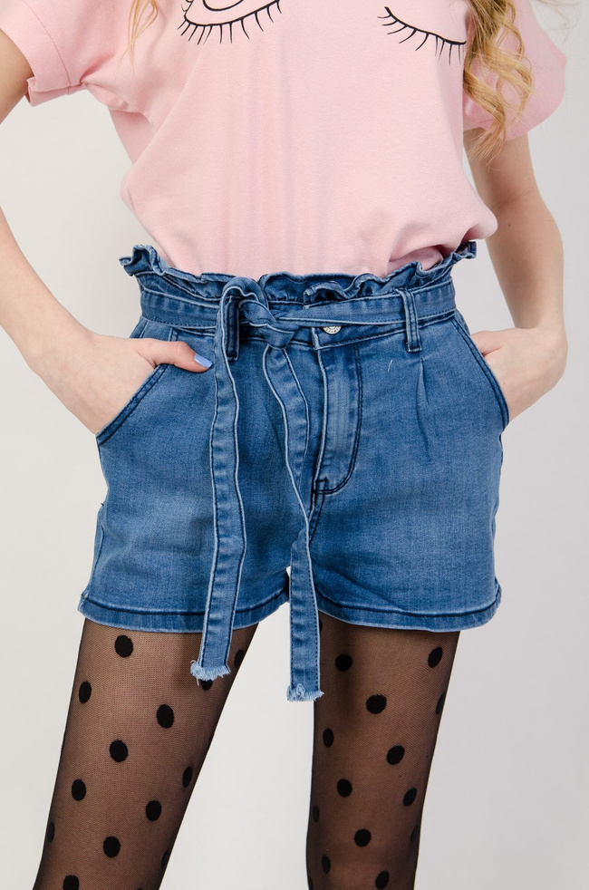 Jeansowe szorty z falbanką w pasie oraz paskiem.