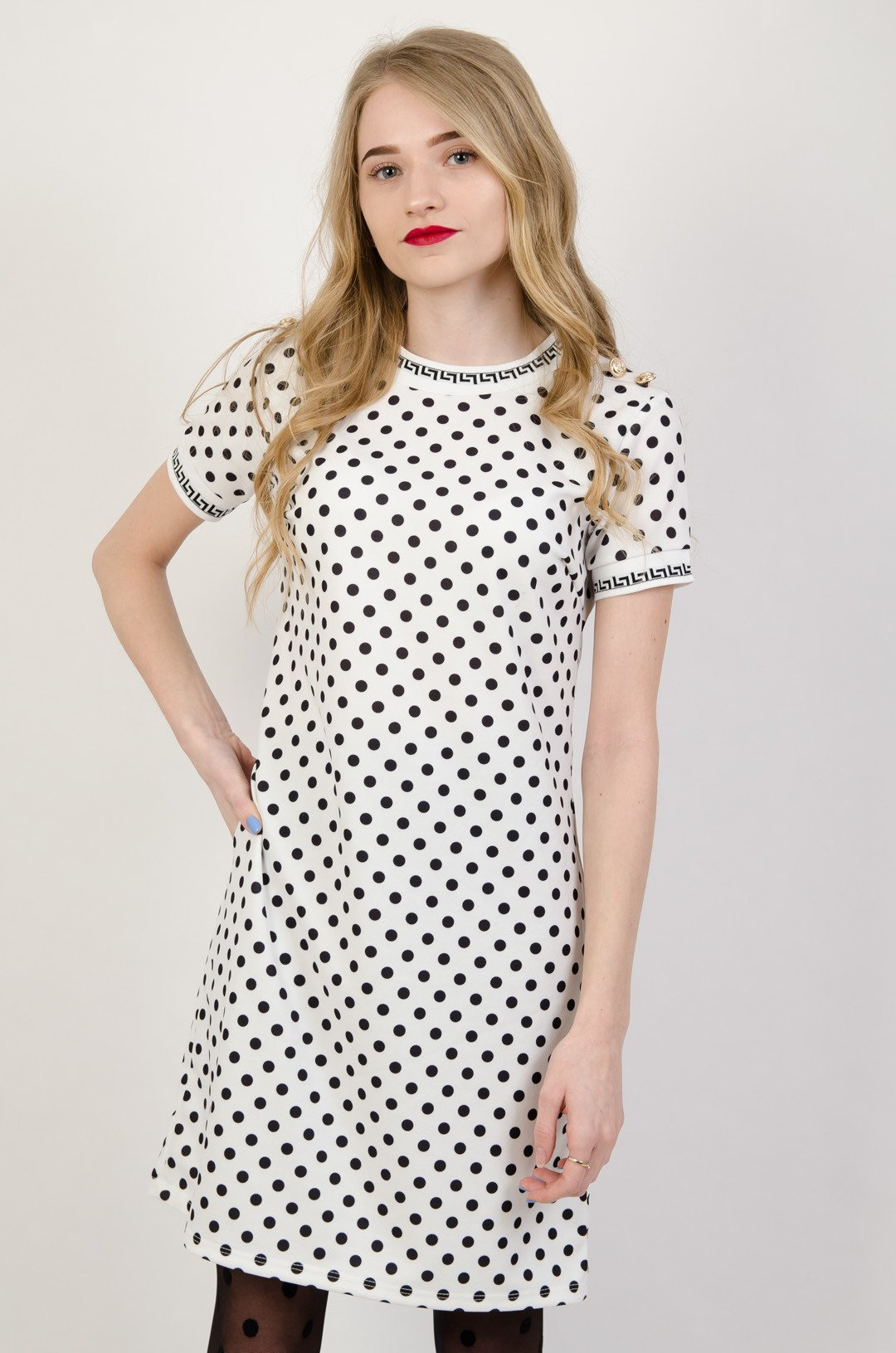 Biała sukienka o prostym kroju w czarne grochy i złotymi guzikami.