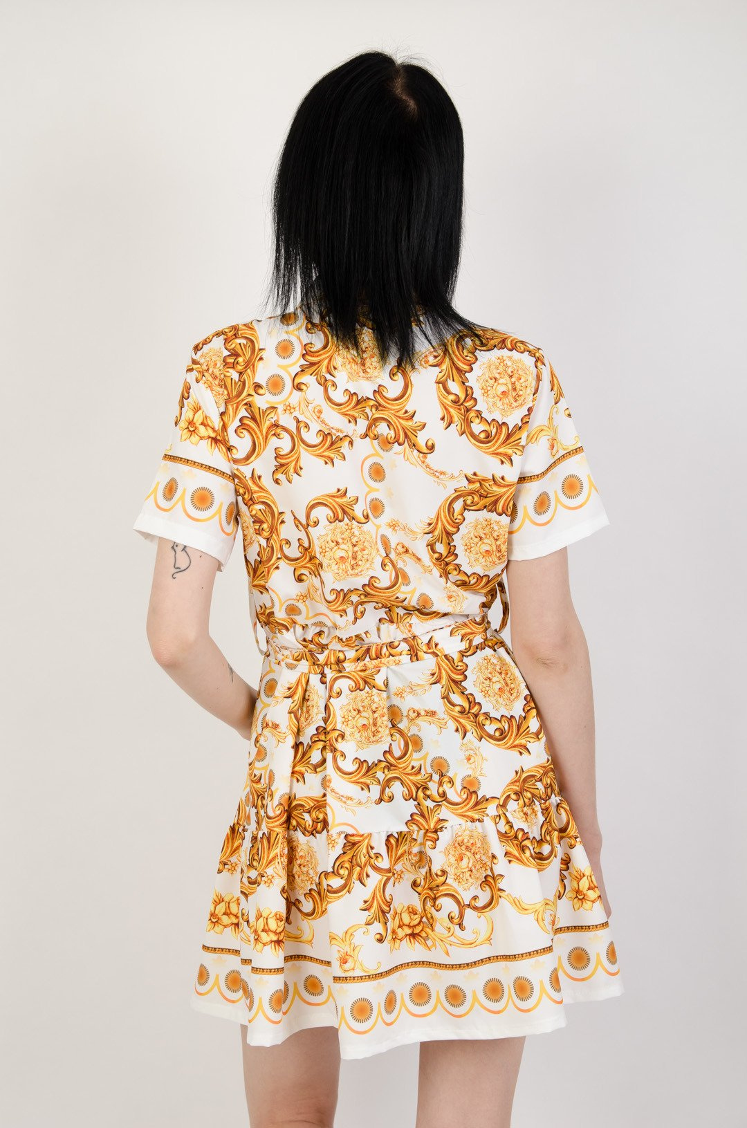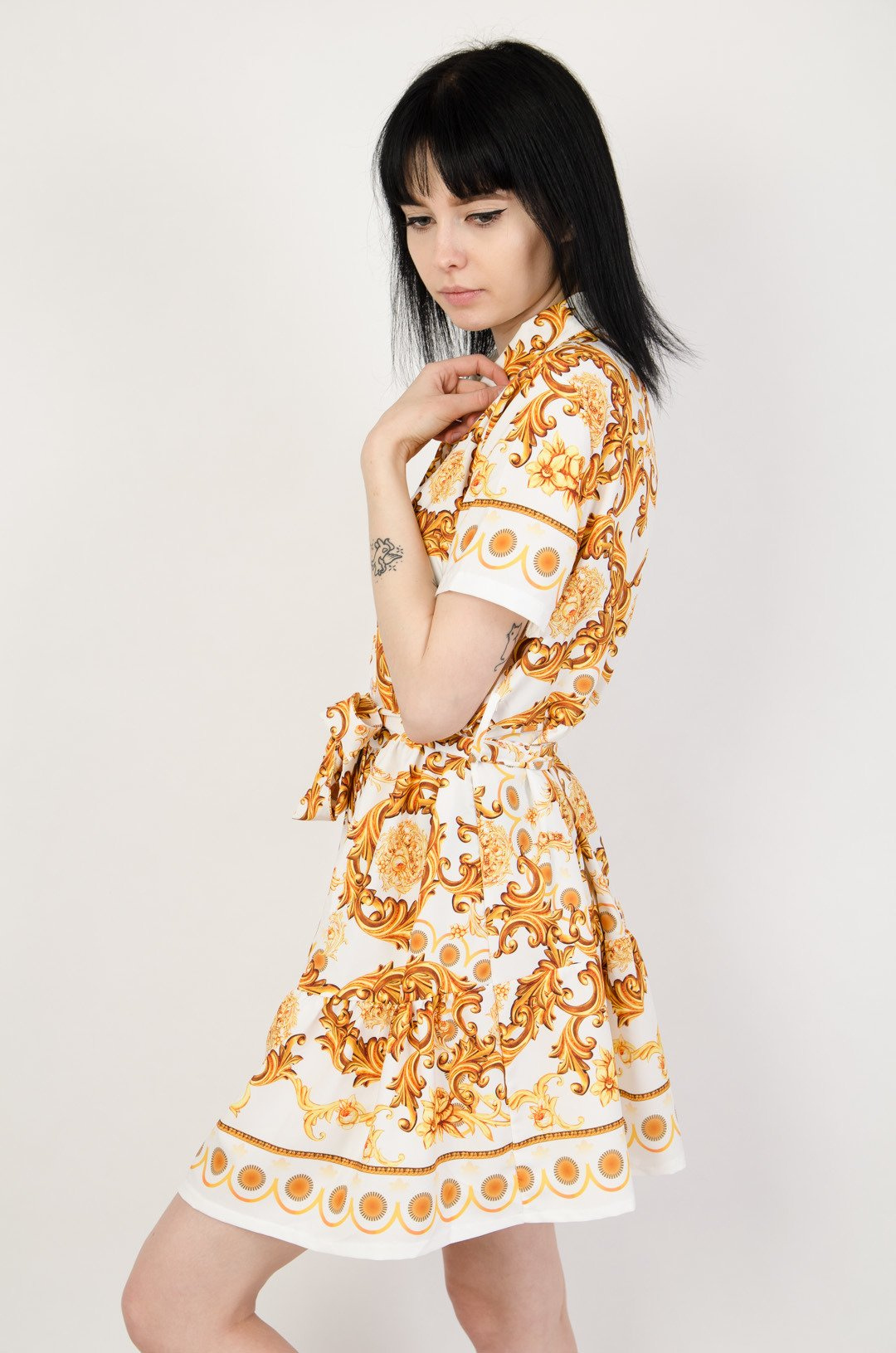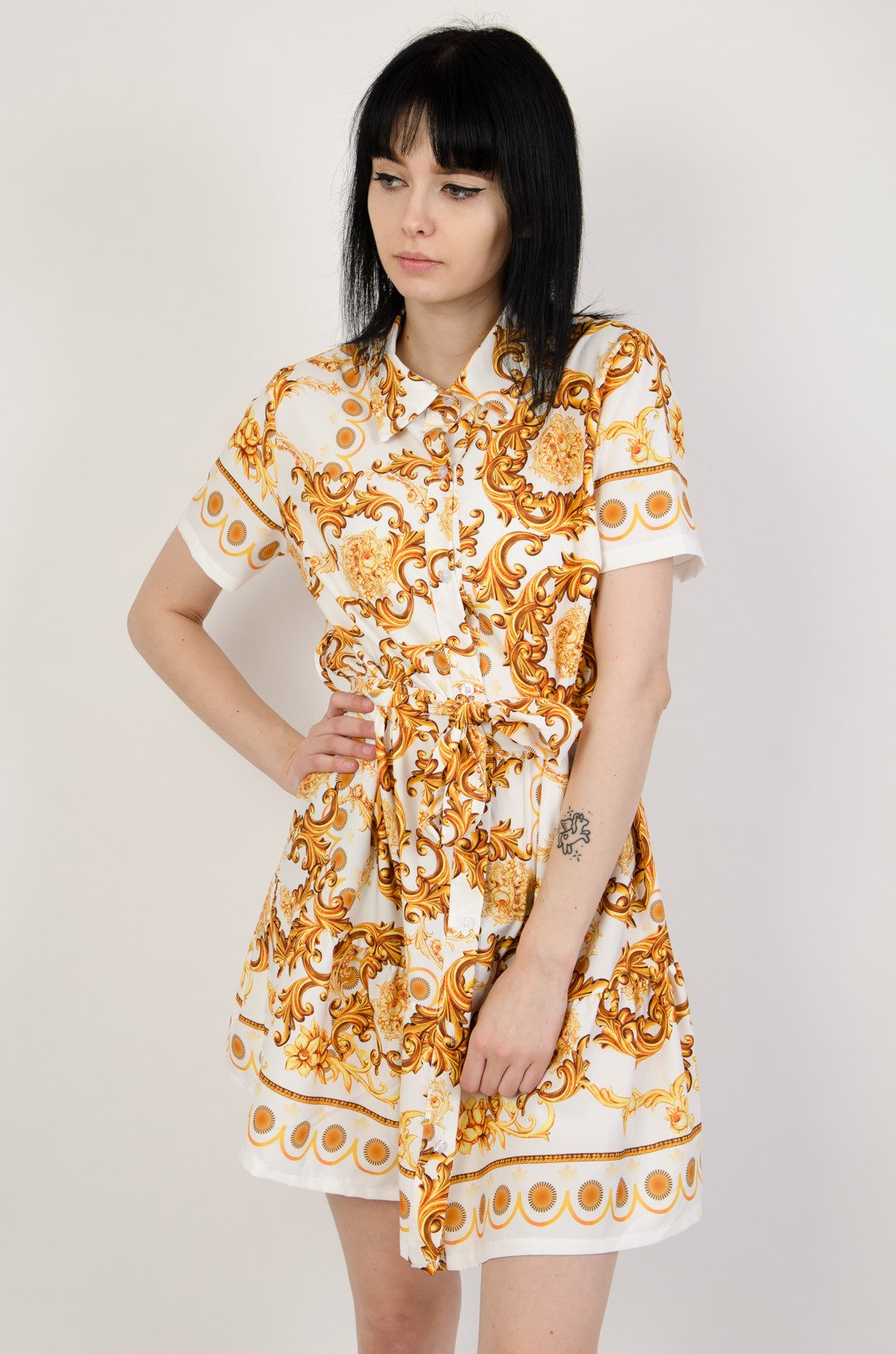 Biała sukienka z kołnierzem w złote wzory