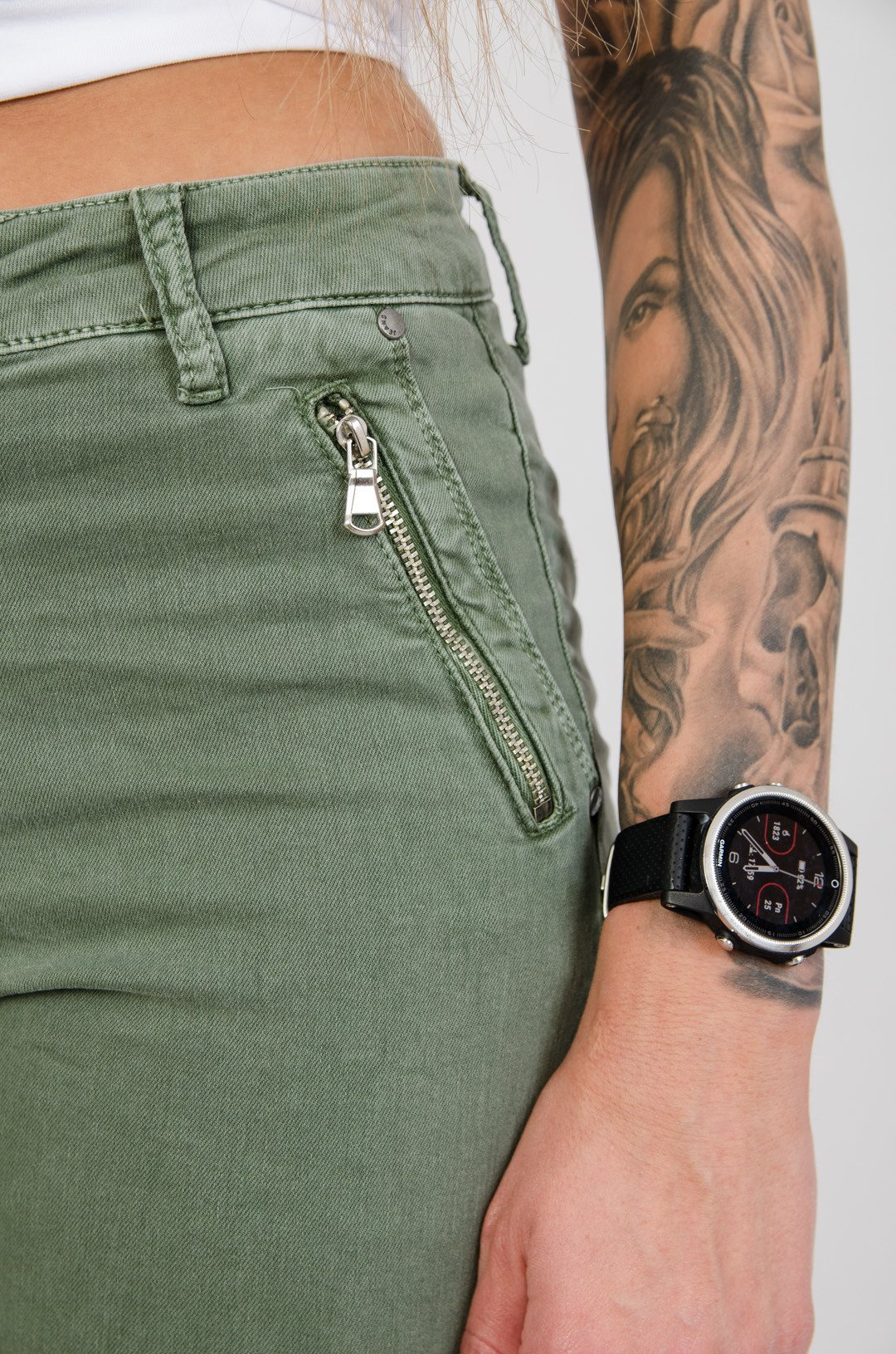Zielone spodnie joggery z zamkami przy kieszeniach.