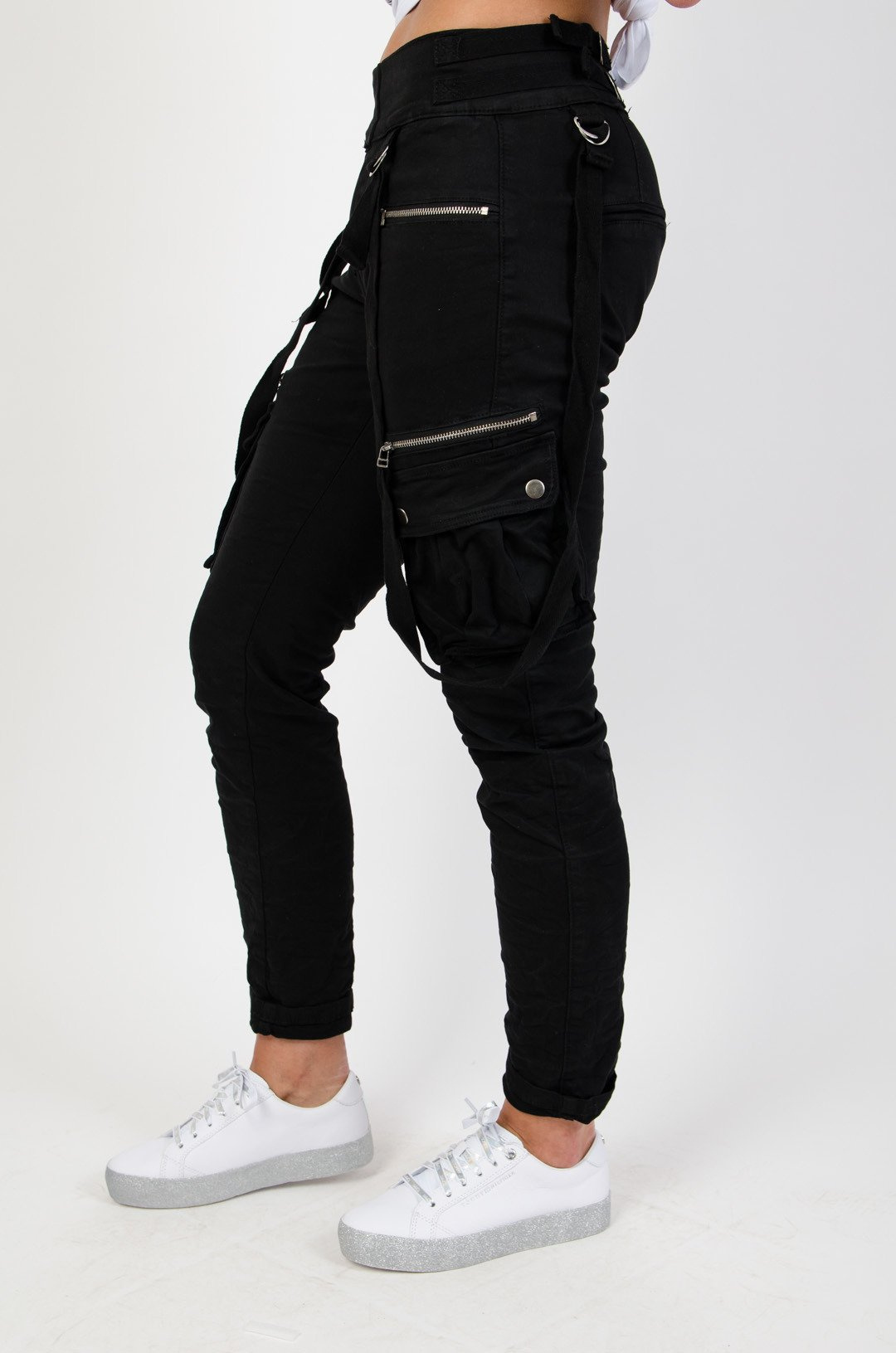 Czarne spodnie typu jogger z zamkami oraz kieszeniami