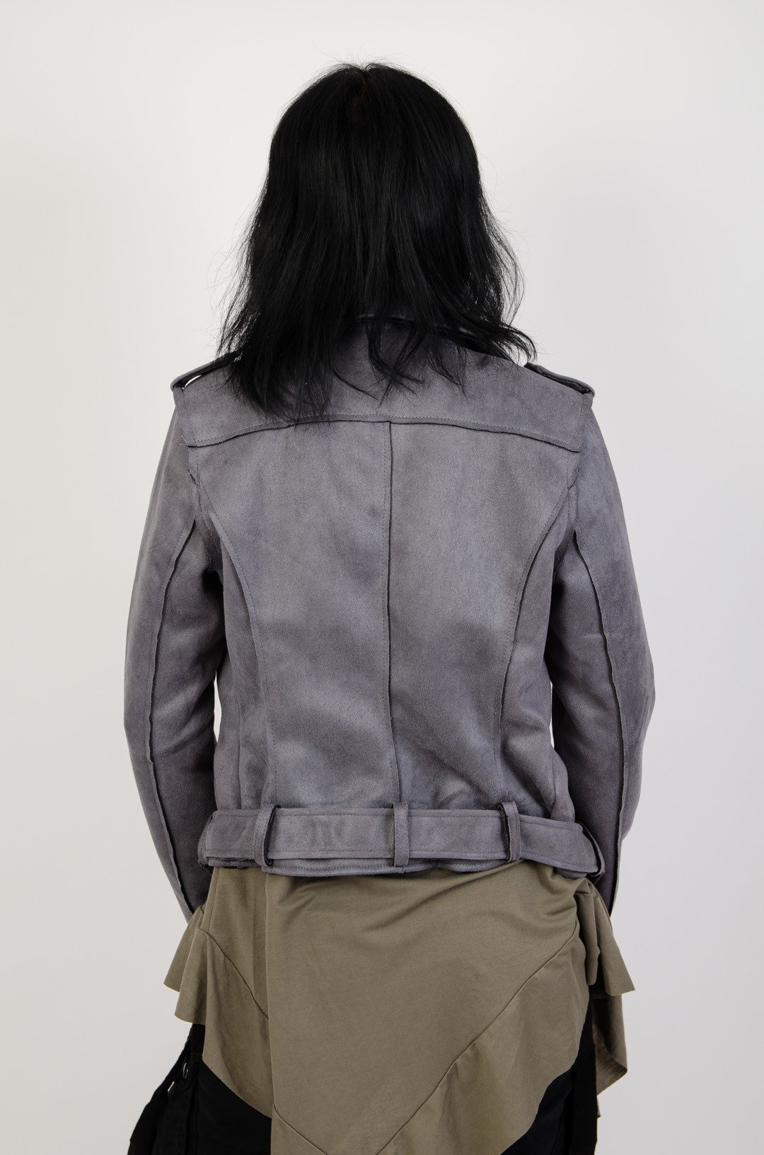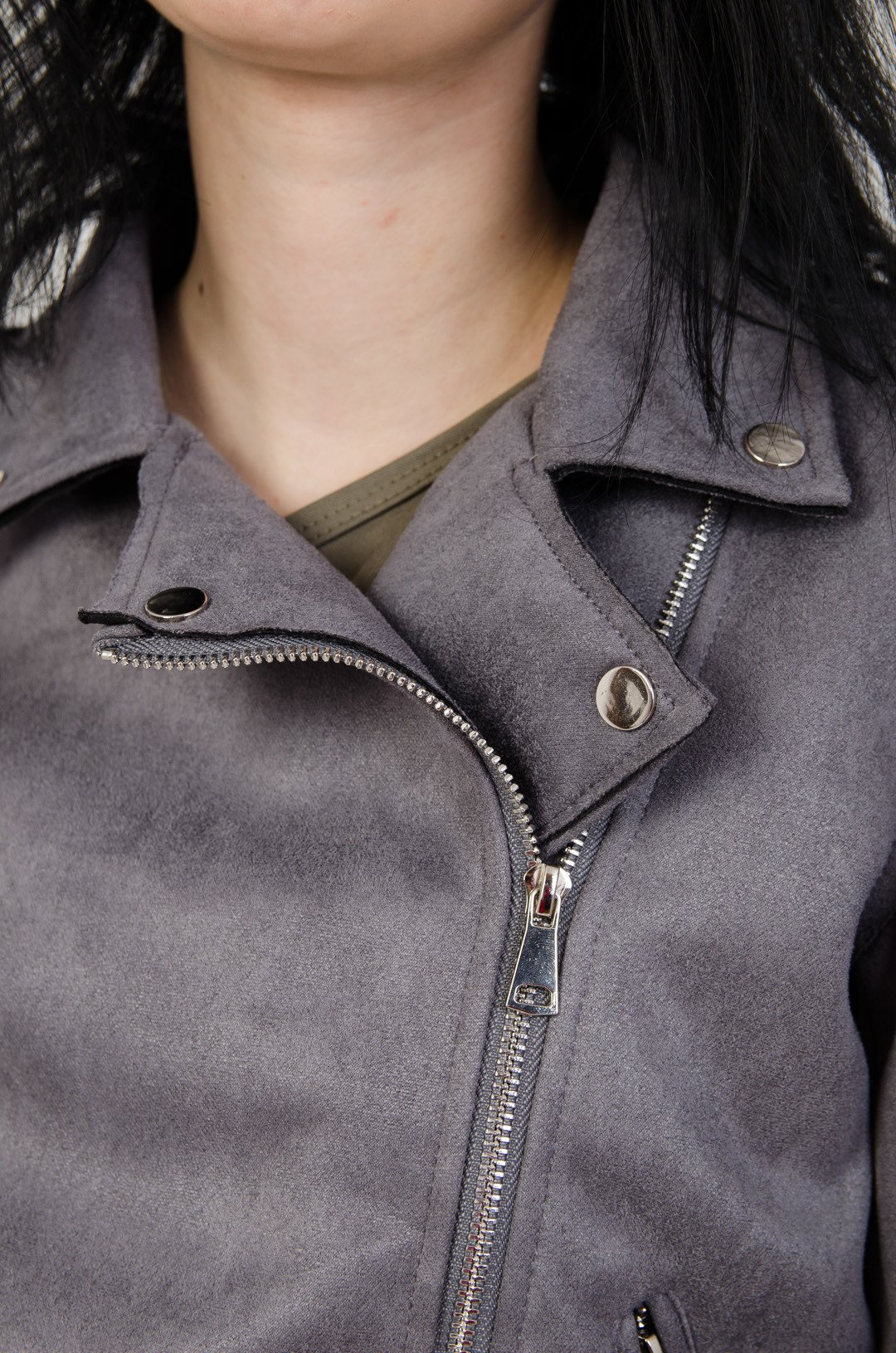 Szara zamszowa kurtka z paskiem na dole oraz srebrnymi zamkami.