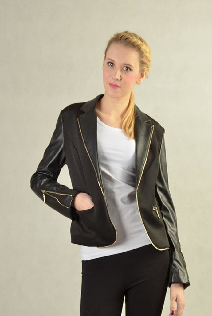 Niezwykle stylowa, taliowana i dopasowana do figury marynarka-ramoneska z łączonych materiałów. Rękawy, oraz kołnierzyk wykonany ze skóry ekologicznej. Dodatkowo na rękawach, oraz z przodu dwa ozdobne zamki. Idealna na wiele okazji.