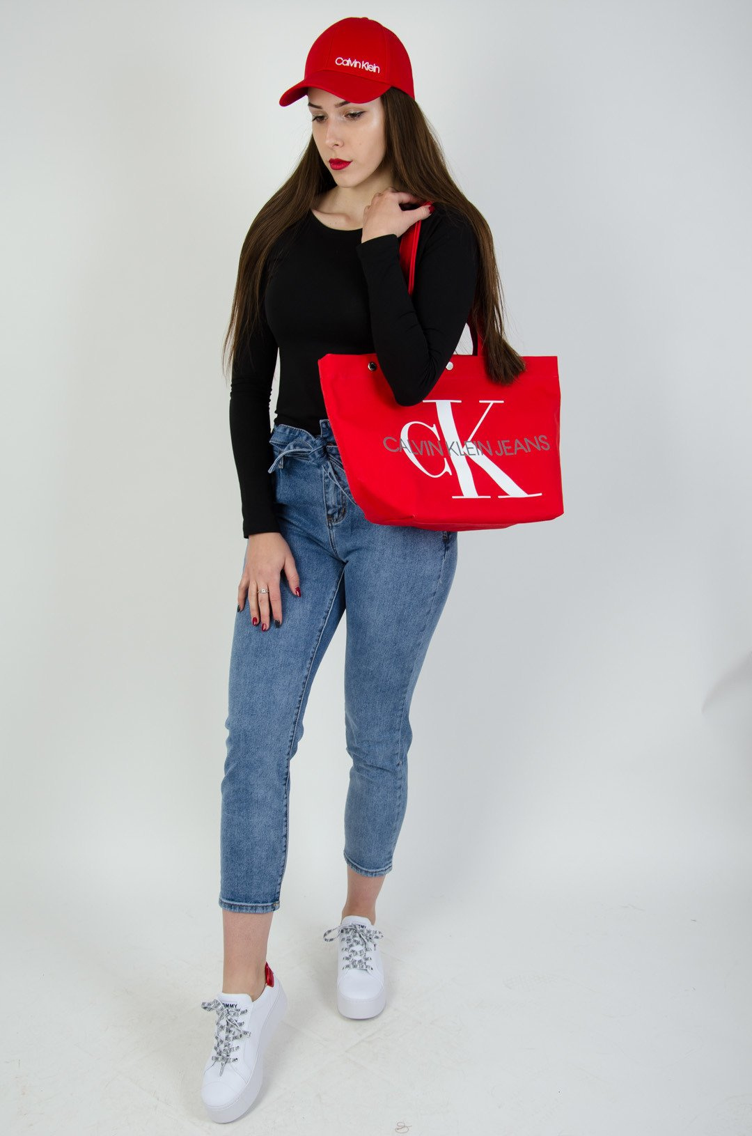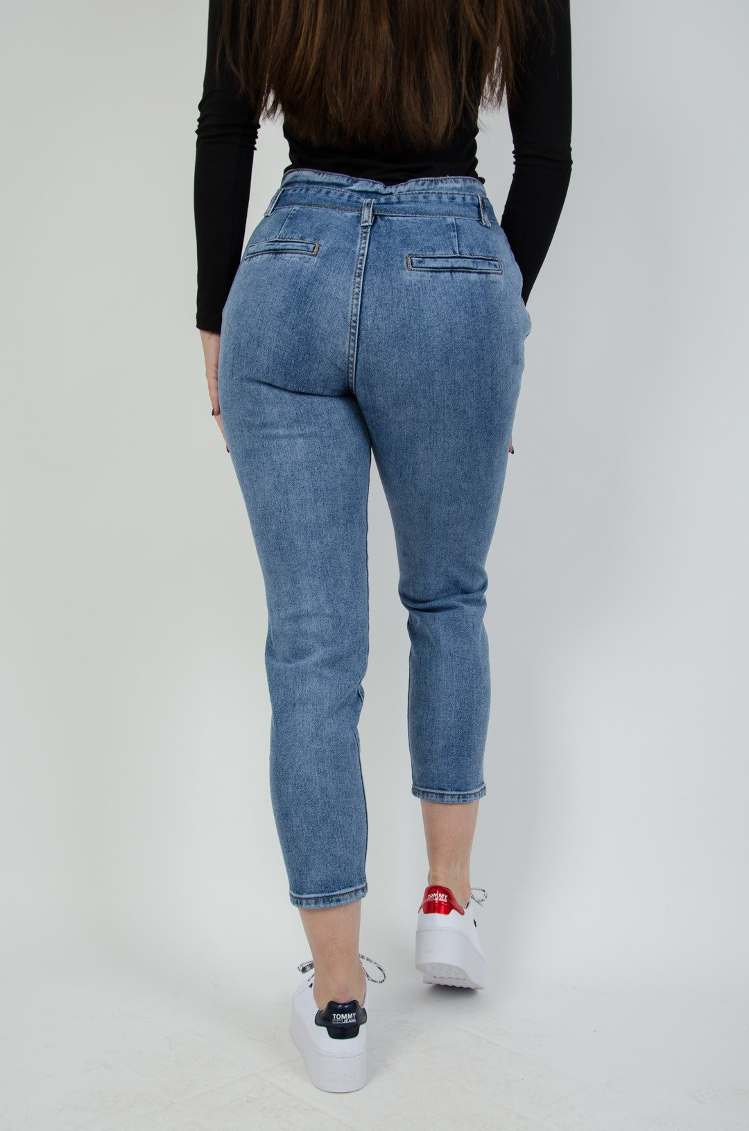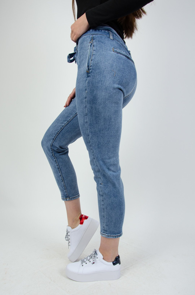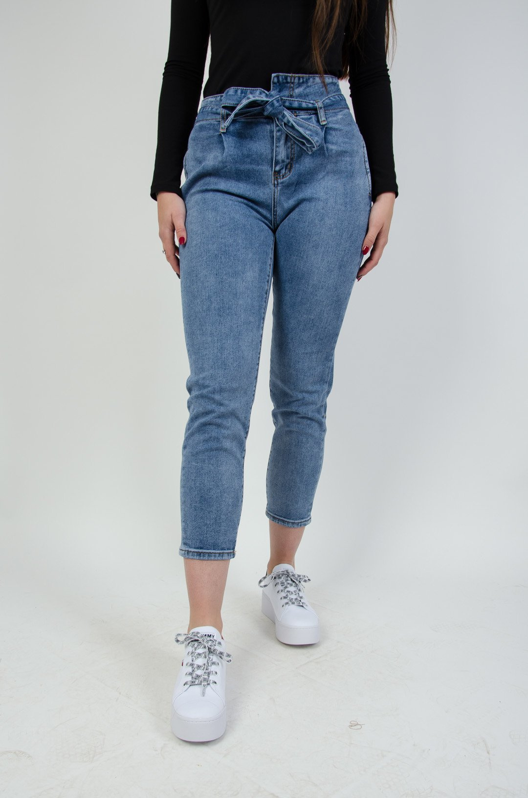Jeansowe haremki z wysokim stanem oraz wiązaniem w pasie
