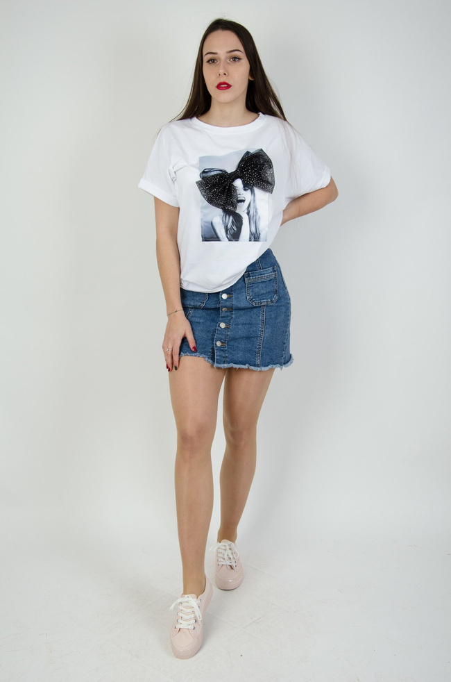 Biała bluzka z motywem kobiety oraz kokardą