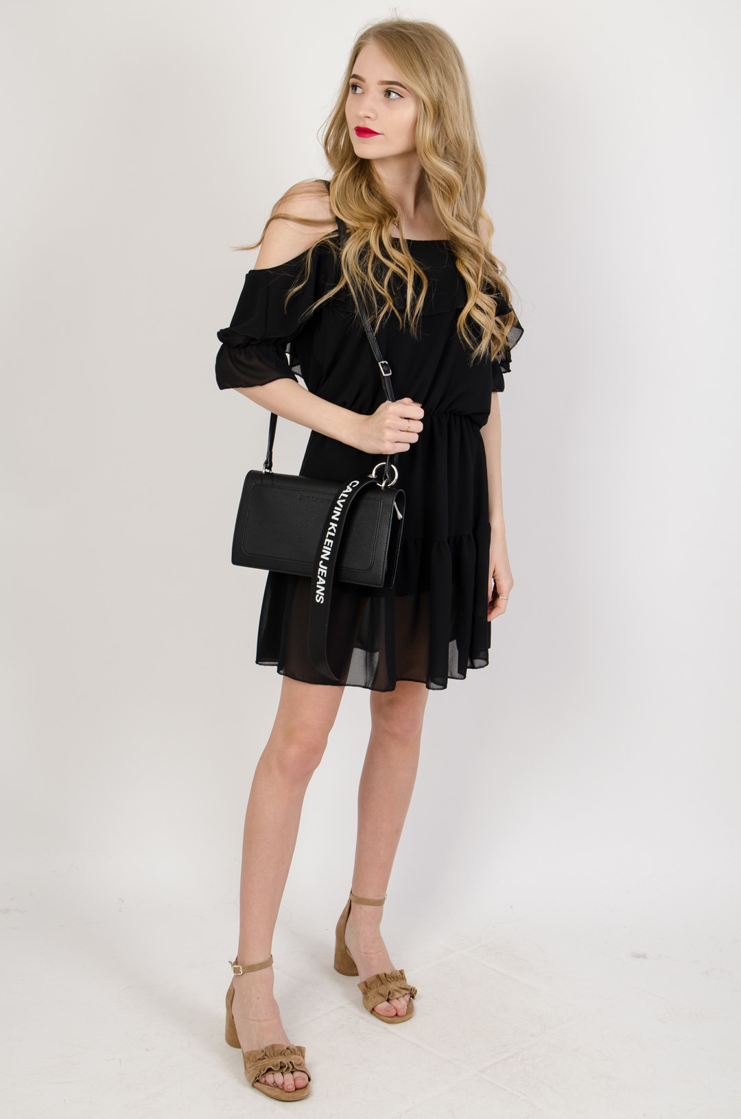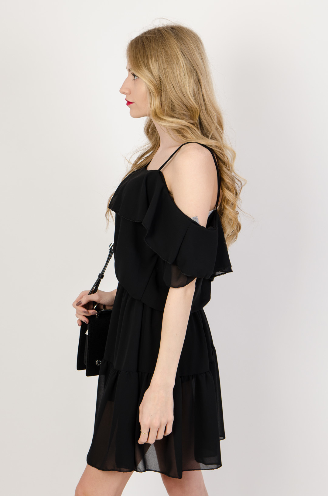 Czarna zwiewna sukienka z odkrytymi ramionami