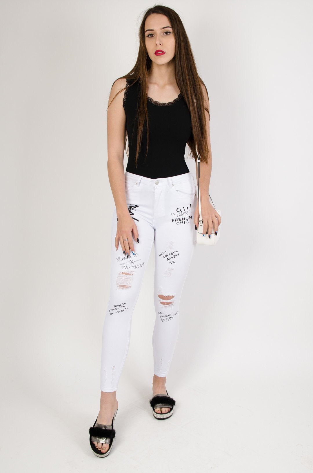 Białe dopasowane spodnie z napisami