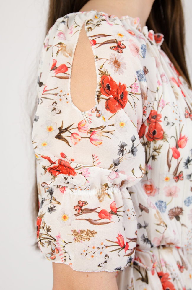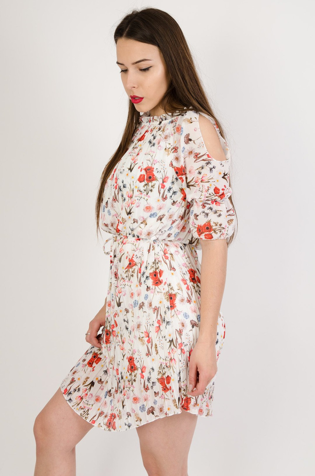 w kwiaty z odkrytymi ramionami, wiązana w pasie