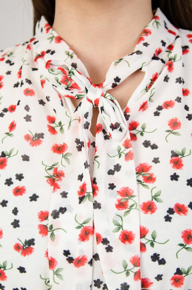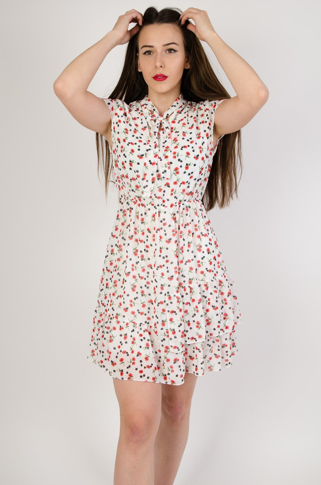Biała sukienka w czerwone kwiatki z gumą w pasie