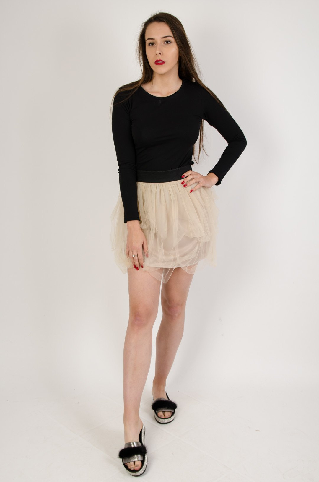 Beżowa tiulowa spódnica z czarną gumą w pasie