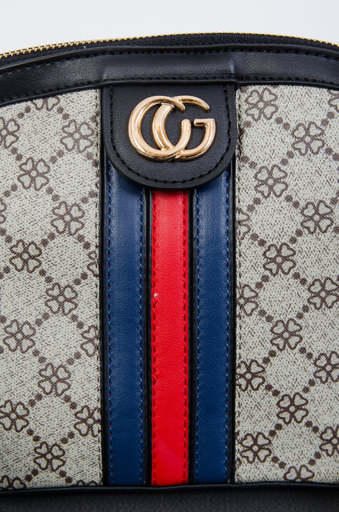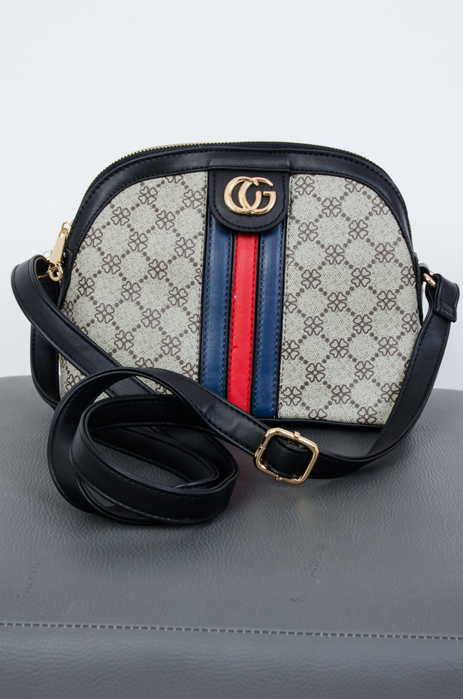 Wzorzysta torebka z czerwono-granatowym paskiem na przodzie