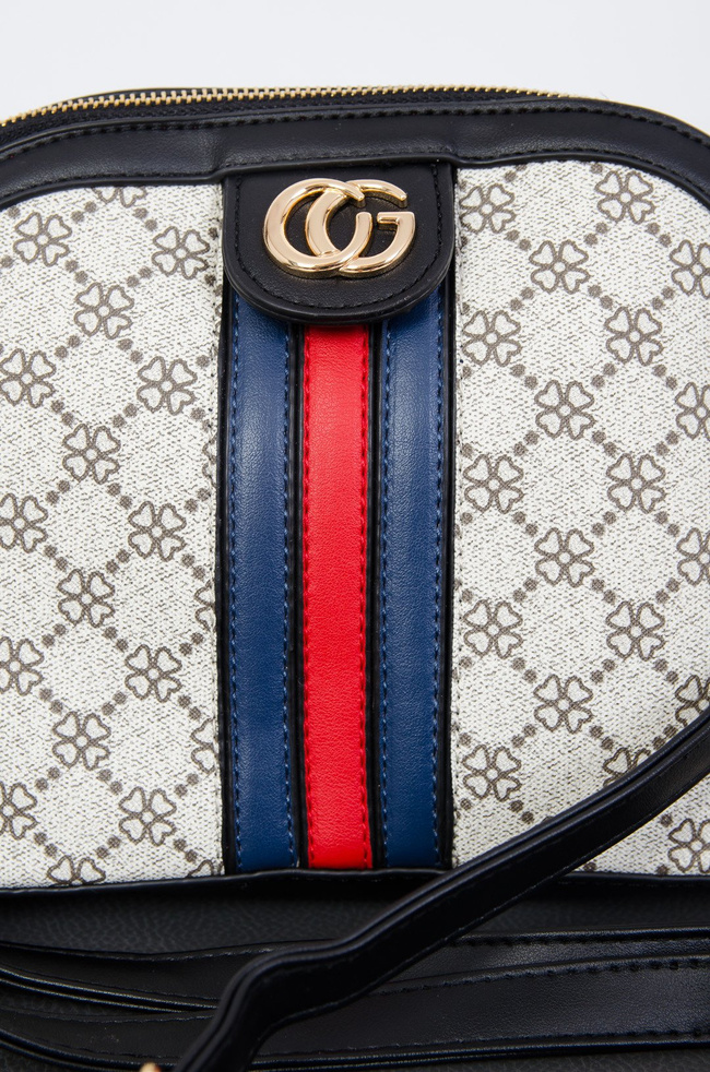 Wzorzysta torebka z czerwono-granatowym paskiem na przodzie