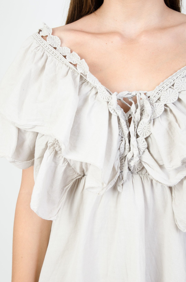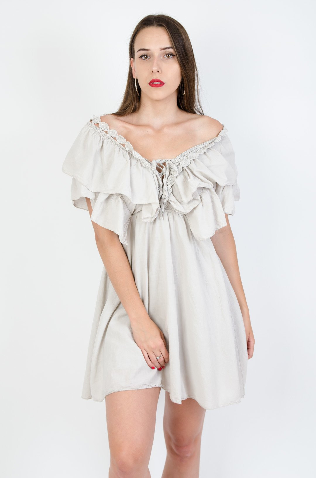Beżowa sukienka z dekoltem w serek i wycięciem na plecach