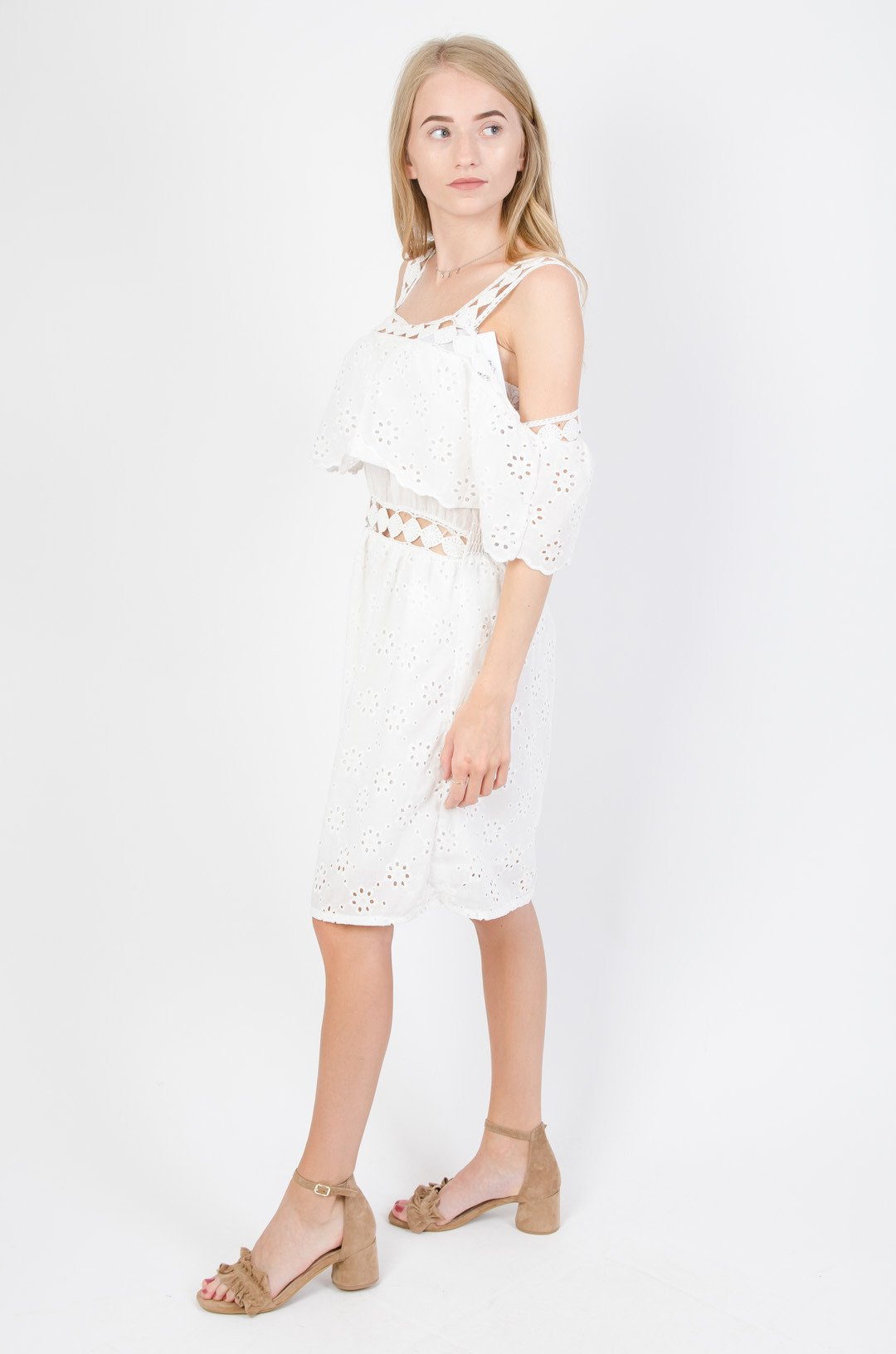 Biała ażurowa sukienka z hiszpańskim dekoltem