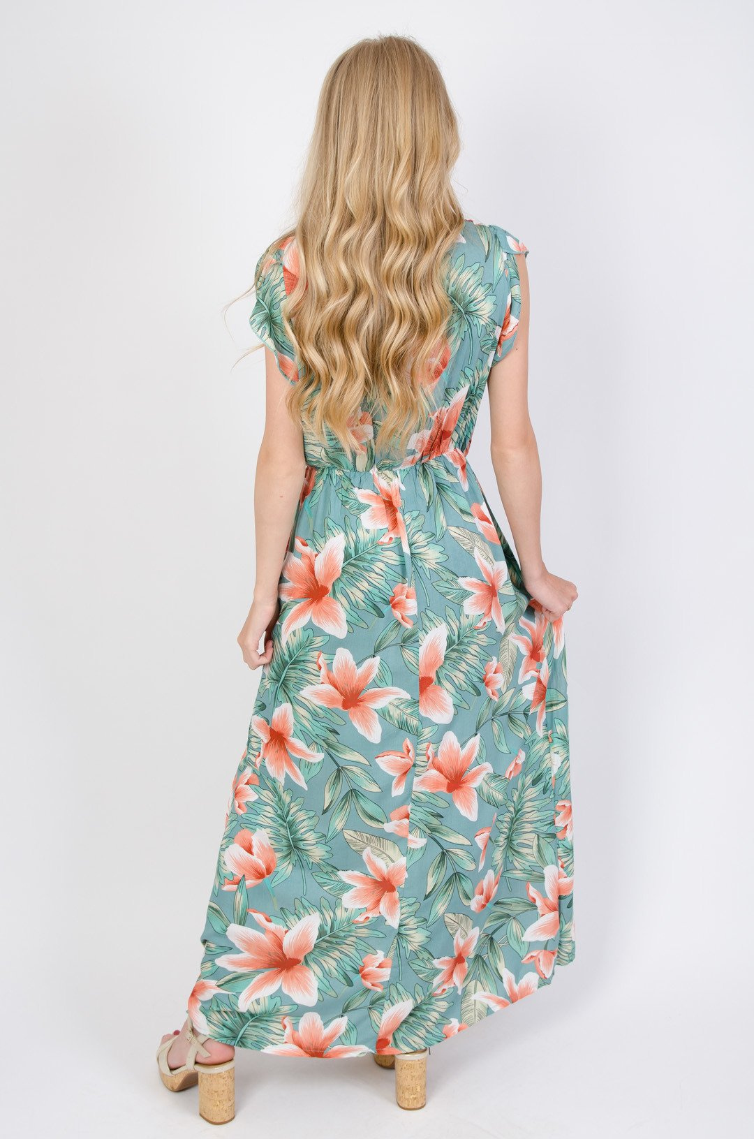 Zielona sukienka w kwiaty z kopertowym dekoltem - guma w pasie
