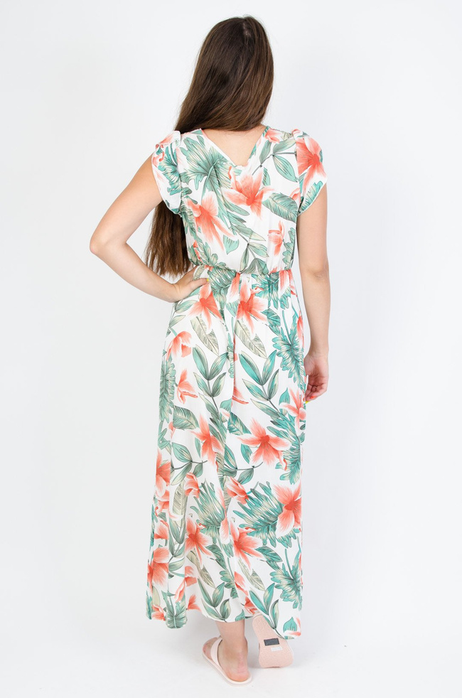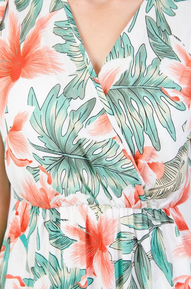 Biała sukienka w kwiaty z kopertowym dekoltem - guma w pasie