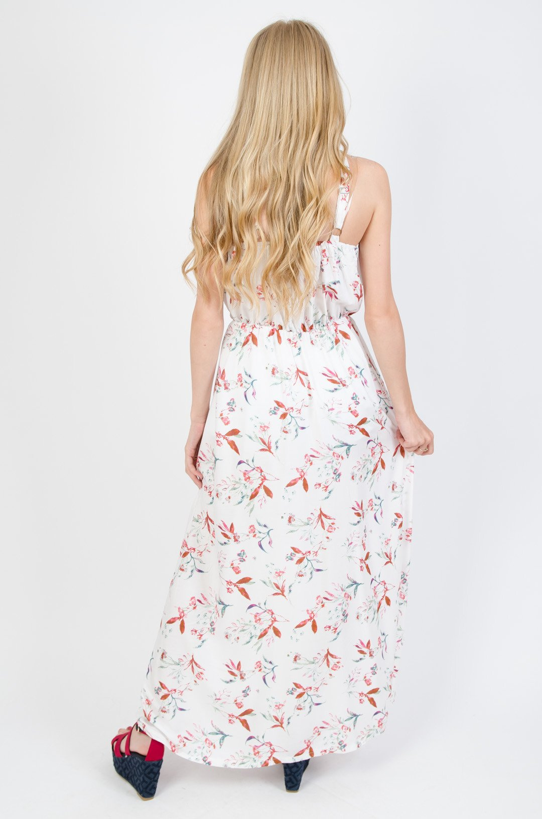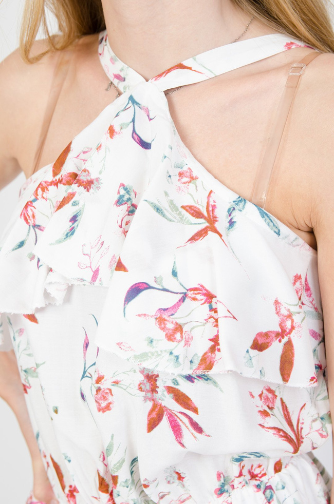Biała sukienka w kwiaty z dekoltem pod szyję- guma w pasie, regulowane ramiączka