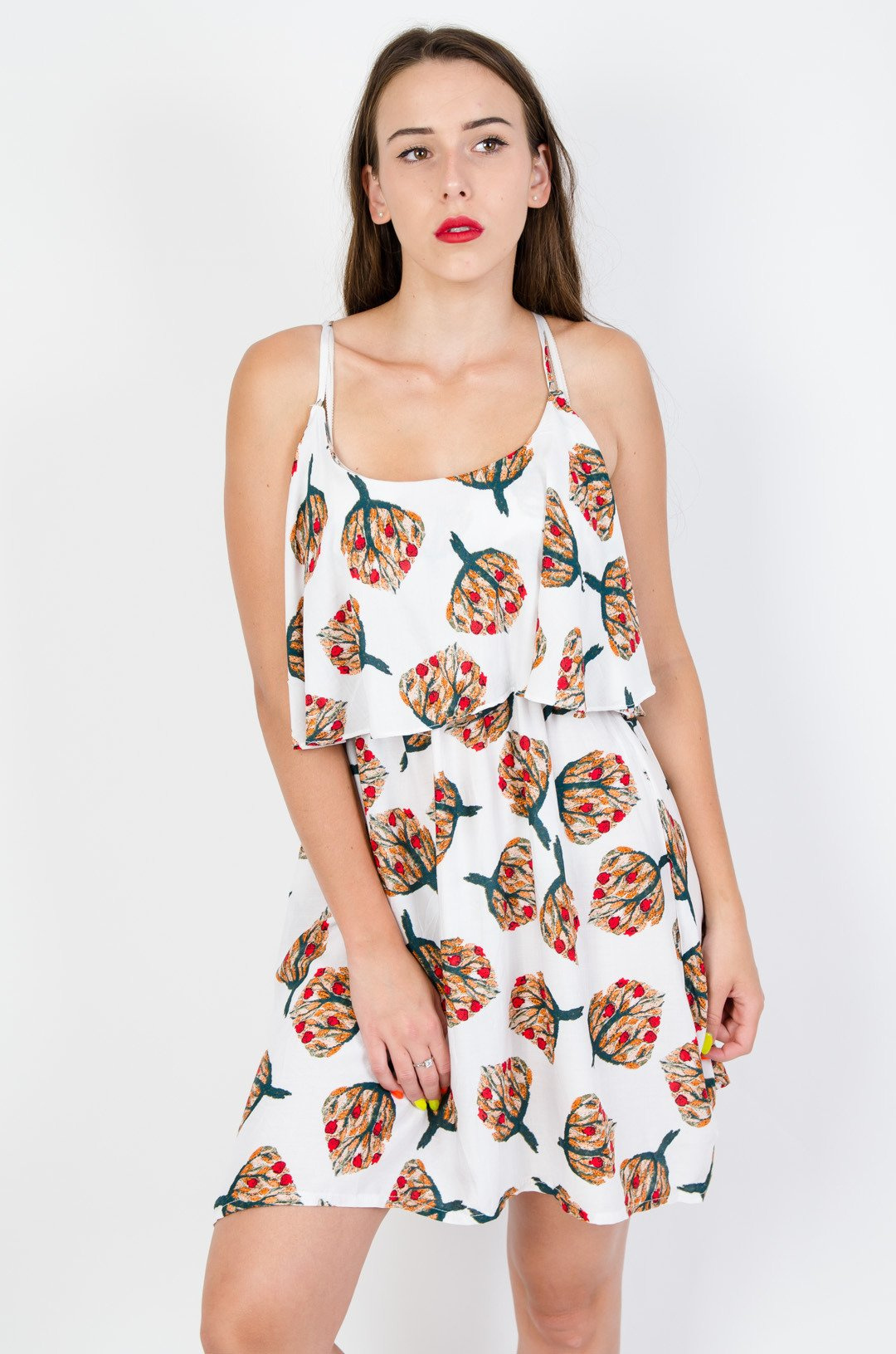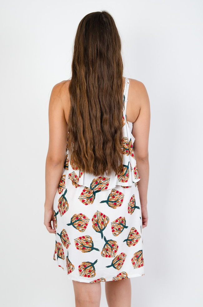 Biała wzorzysta sukienka z hiszpańskim dekoltem - guma w pasie