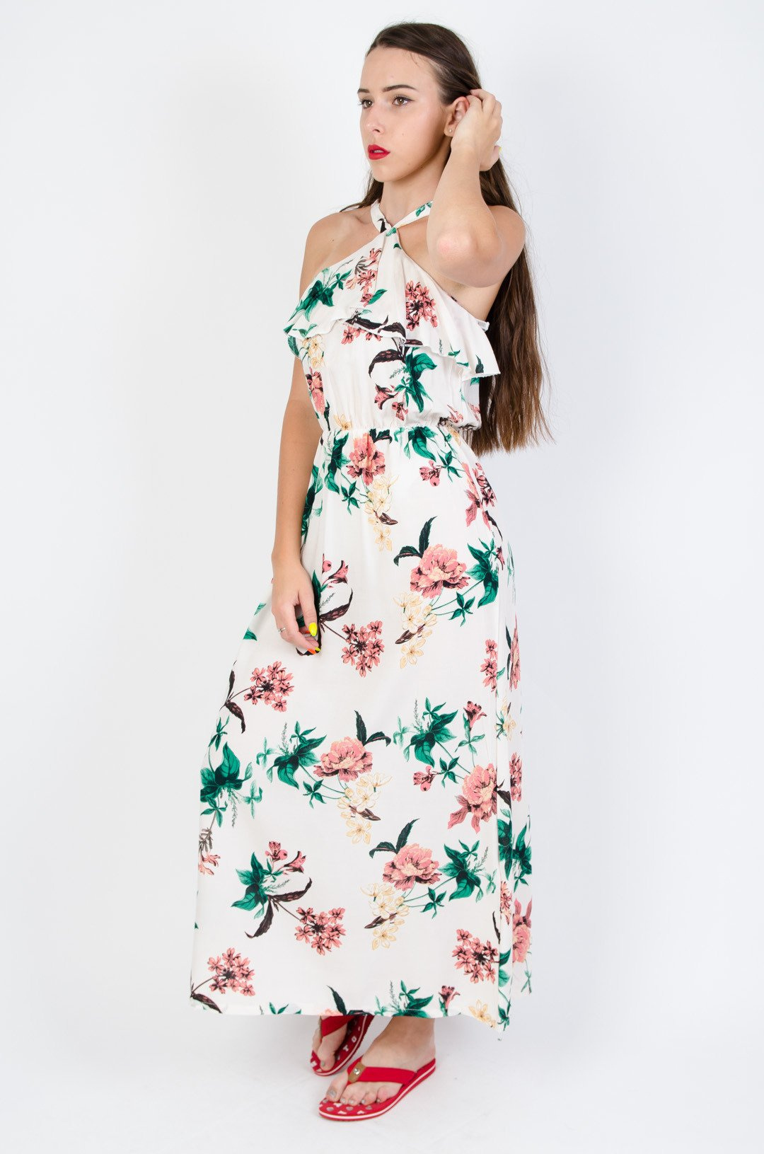 Kremowa sukienka pod szyję w kwiaty- guma w pasie